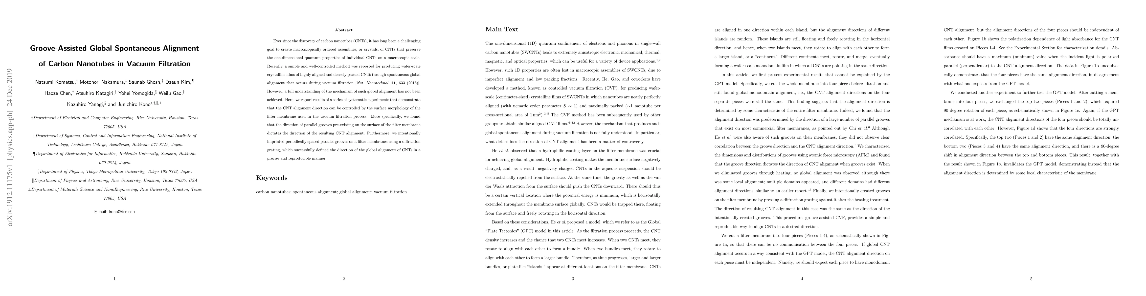 This paper demonstrates that the alignment direction of carbon nanotubes (CNTs) in vacuum filtration can be controlled by the surface morphology of the filter membrane, specifically by the direction of parallel grooves. By imprinting grooves using a diffraction grating, the researchers achieved precise and reproducible global alignment of CNTs.