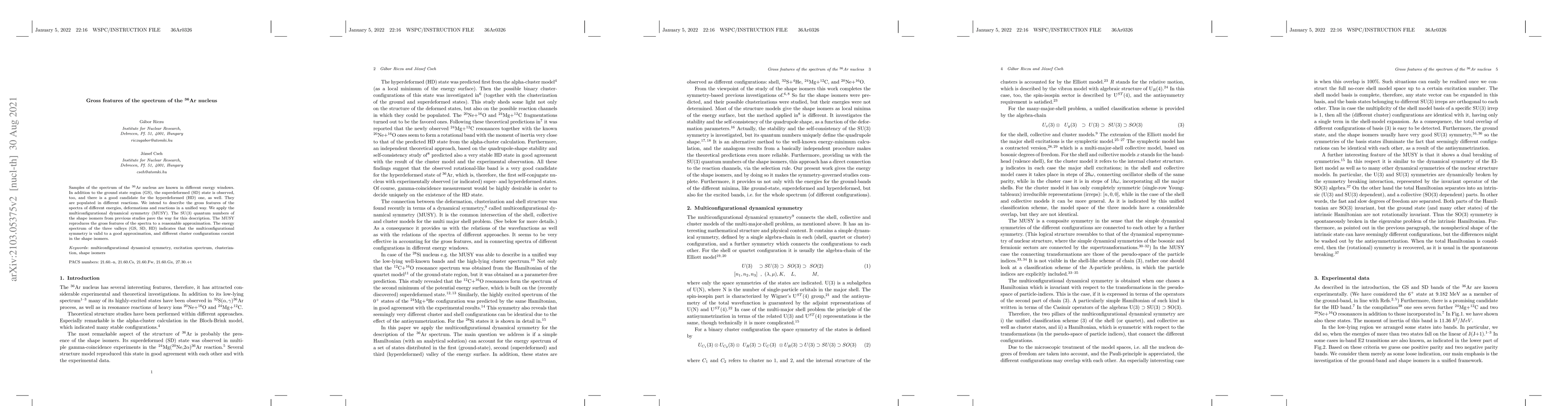 Samples of the spectrum of the 36Ar nucleus are known in different energy windows. In addition to the ground state region (GS), the superdeformed (SD) state is observed, too, and there is a good candidate for the hyperdeformed (HD) one, as well. They are populated in different reactions. We intend to describe the gross features of the spectra of different energies, deformations and reactions in a unified way. We apply the multiconfigurational dynamical symmetry (MUSY). The SU(3) quantum numbers of the shape isomers from previous studies pave the way for this description. The MUSY reproduces the gross features of the spectra to a reasonable approximation. The energy spectrum of the three valleys (GS, SD, HD) indicates that the multiconfigurational symmetry is valid to a good approximation, and different cluster configurations coexist in the shape isomers.