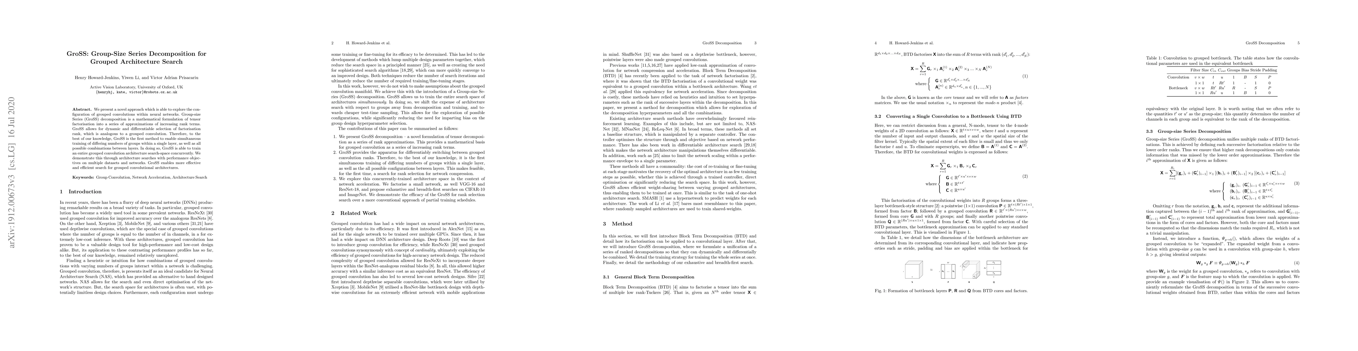 We present a novel approach which is able to explore the configuration of grouped convolutions within neural networks. Group-size Series (GroSS) decomposition is a mathematical formulation of tensor factorisation into a series of approximations of increasing rank terms. GroSS allows for dynamic and differentiable selection of factorisation rank, which is analogous to a grouped convolution. Therefore, to the best of our knowledge, GroSS is the first method to enable simultaneous training of differing numbers of groups within a single layer, as well as all possible combinations between layers. In doing so, GroSS is able to train an entire grouped convolution architecture search-space concurrently. We demonstrate this through architecture searches with performance objectives on multiple datasets and networks. GroSS enables more effective and efficient search for grouped convolutional architectures.