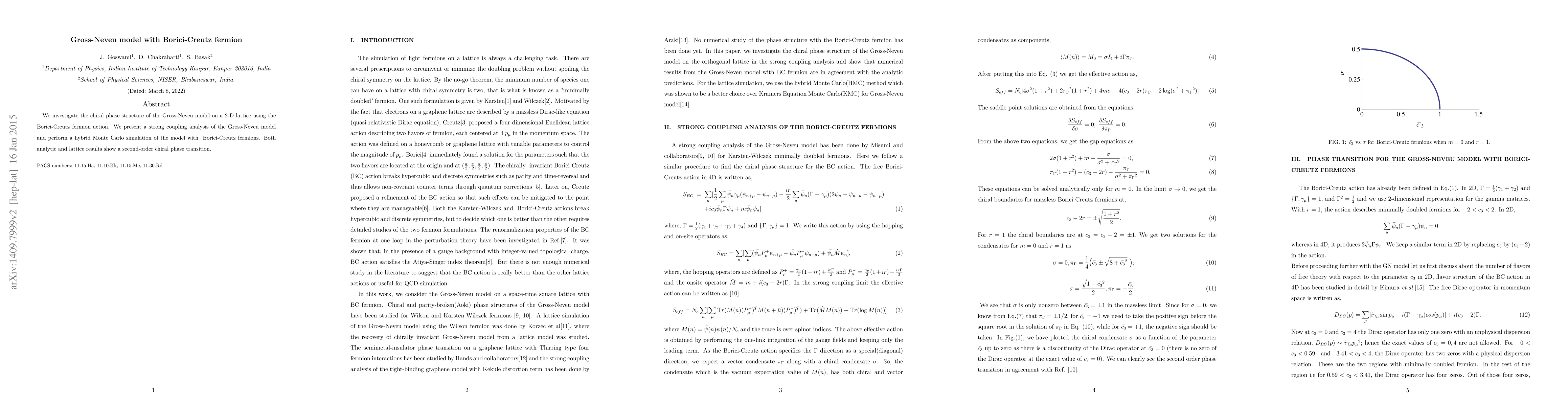 This study examines the chiral phase structure of the Gross-Neveu model on a 2-D lattice with the Borici-Creutz fermion action, revealing a second-order chiral phase transition through strong coupling analysis and hybrid Monte Carlo simulations.