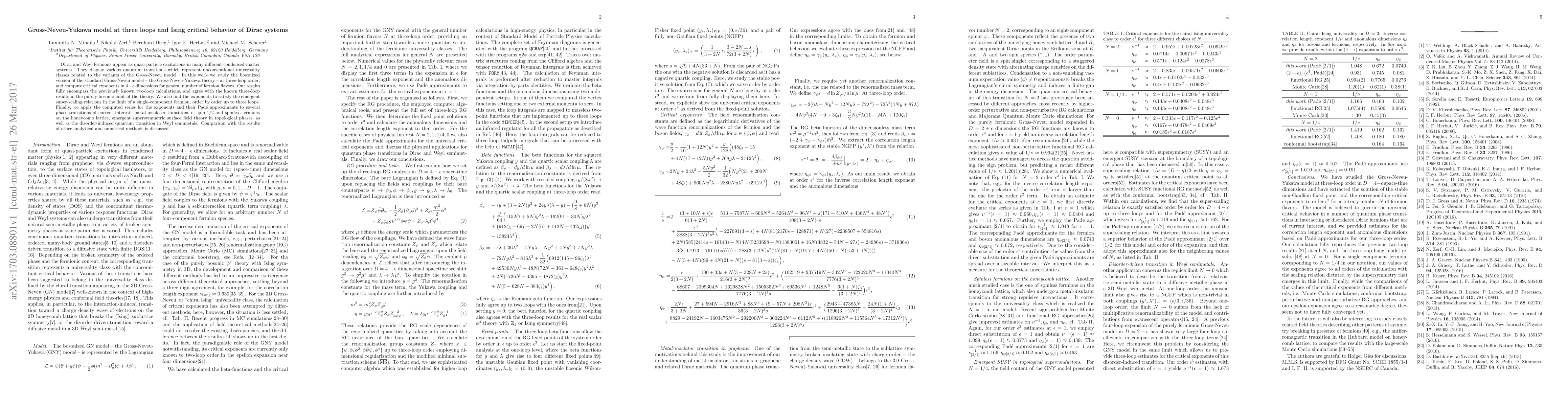 Dirac and Weyl fermions appear as quasi-particle excitations in many different condensed-matter systems. They display various quantum transitions which represent unconventional universality classes related to the variants of the Gross-Neveu model. In this work we study the bosonized version of the standard Gross-Neveu model -- the Gross-Neveu-Yukawa theory -- at three-loop order, and compute critical exponents in $4-\epsilon$ dimensions for general number of fermion flavors. Our results fully encompass the previously known two-loop calculations, and agree with the known three-loop results in the purely bosonic limit of the theory. We also find the exponents to satisfy the emergent super-scaling relations in the limit of a single-component fermion, order by order up to three loops. Finally, we apply the computed series for the exponents and their Pad\'e approximants to several phase transitions of current interest: metal-insulator transitions of spin-1/2 and spinless fermions on the honeycomb lattice, emergent supersymmetric surface field theory in topological phases, as well as the disorder-induced quantum transition in Weyl semimetals. Comparison with the results of other analytical and numerical methods is discussed.