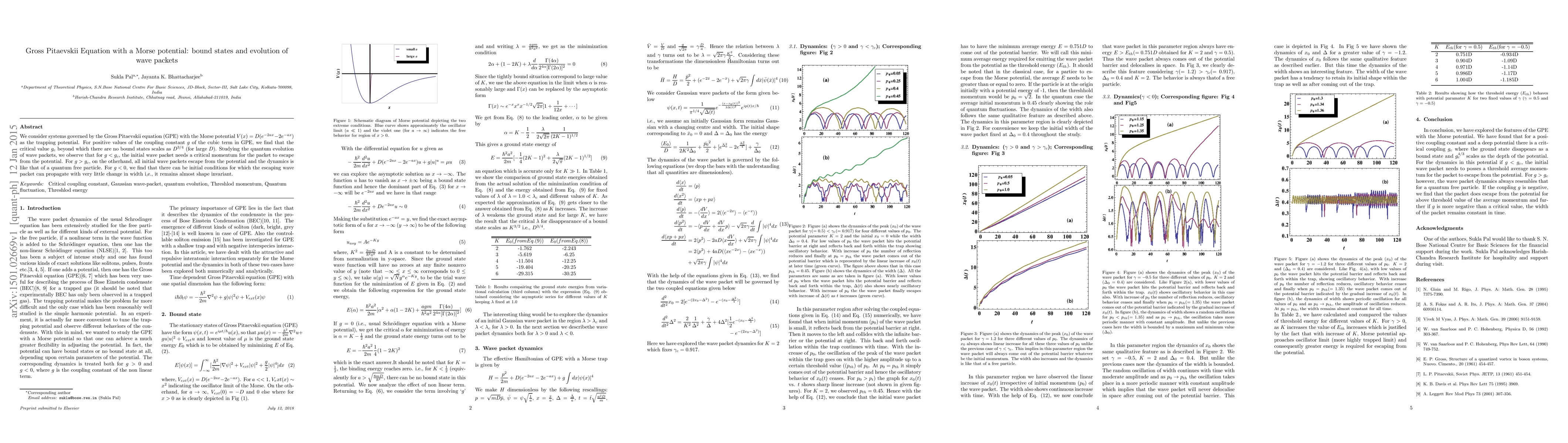 This paper investigates the Gross Pitaevskii equation with a Morse potential, finding that the critical coupling constant $g_c$ for bound states scales as $D^{3/4}$ for large $D$. For $g<g_c$, wave packets require a critical momentum to escape, while for $g>g_c$, all packets escape like free particles; for $g<0$, some packets remain shape invariant during escape.