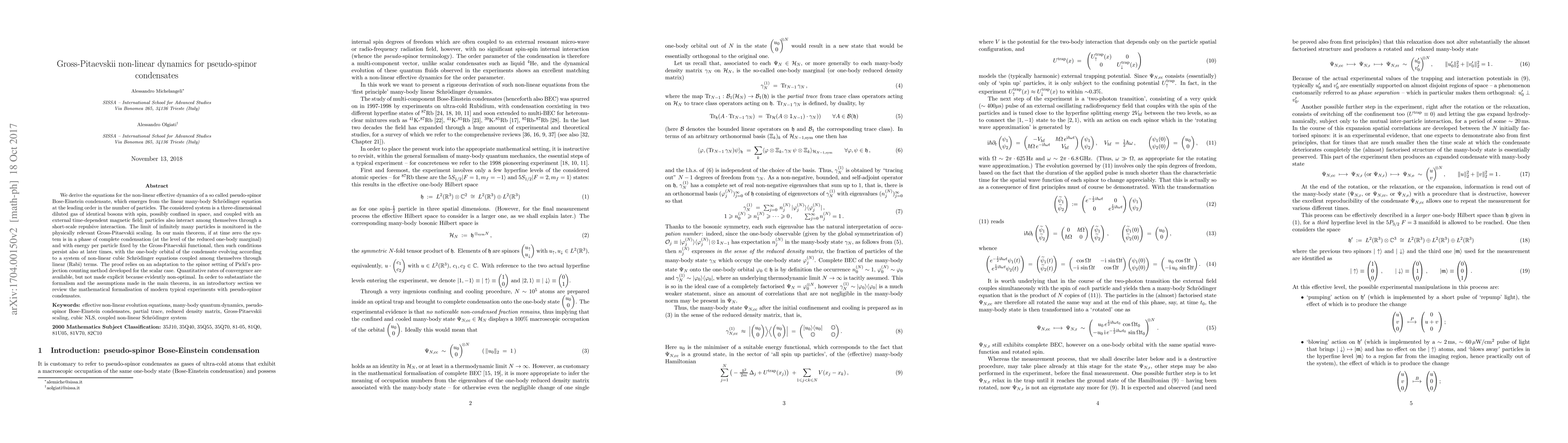 We derive the equations for the non-linear effective dynamics of a so called pseudo-spinor Bose-Einstein condensate, which emerges from the linear many-body Schr\"odinger equation at the leading order in the number of particles. The considered system is a three-dimensional diluted gas of identical bosons with spin, possibly confined in space, and coupled with an external time-dependent magnetic field; particles also interact among themselves through a short-scale repulsive interaction. The limit of infinitely many particles is monitored in the physically relevant Gross-Pitaevskii scaling. In our main theorem, if at time zero the system is in a phase of complete condensation (at the level of the reduced one-body marginal) and with energy per particle fixed by the Gross-Pitaevskii functional, then such conditions persist also at later times, with the one-body orbital of the condensate evolving according to a system of non-linear cubic Schr\"odinger equations coupled among themselves through linear (Rabi) terms. The proof relies on an adaptation to the spinor setting of Pickl's projection counting method developed for the scalar case. Quantitative rates of convergence are available, but not made explicit because evidently non-optimal. In order to substantiate the formalism and the assumptions made in the main theorem, in an introductory section we review the mathematical formalisation of modern typical experiments with pseudo-spinor condensates.