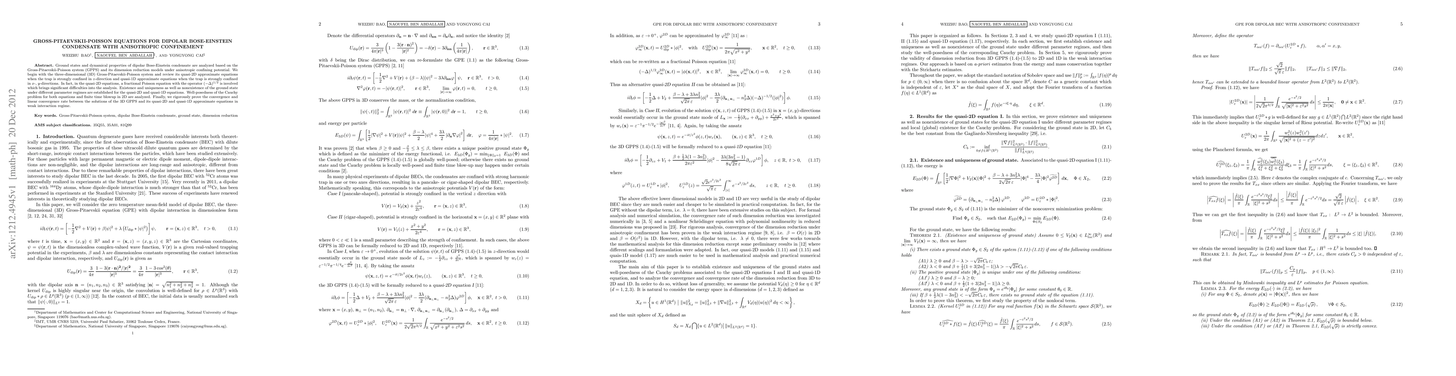 Ground states and dynamical properties of dipolar Bose-Einstein condensate are analyzed based on the Gross-Pitaevskii-Poisson system (GPPS) and its dimension reduction models under anisotropic confining potential. We begin with the three-dimensional (3D) Gross-Pitaevskii-Poisson system and review its quasi-2D approximate equations when the trap is strongly confined in $z$-direction and quasi-1D approximate equations when the trap is strongly confined in $x$-, $y$-directions. In fact, in the quasi-2D equations, a fractional Poisson equation with the operator $(-\Delta)^{1/2}$ is involved which brings significant difficulties into the analysis. Existence and uniqueness as well as nonexistence of the ground state under different parameter regimes are established for the quasi-2D and quasi-1D equations. Well-posedness of the Cauchy problem for both equations and finite time blowup in 2D are analyzed. Finally, we rigorously prove the convergence and linear convergence rate between the solutions of the 3D GPPS and its quasi-2D and quasi-1D approximate equations in weak interaction regime.