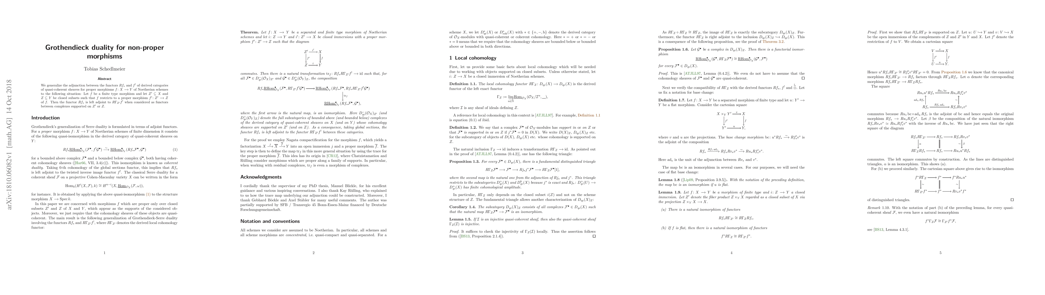 This paper generalizes Grothendieck duality to non-proper morphisms, showing that for a finite type morphism $f$ with closed subsets $Z' \subseteq X$ and $Z \subseteq Y$ where $f$ restricts to a proper morphism $f'$, the functor $Rf_*$ is left adjoint to $R\Gamma_{Z'}f^!$ for complexes supported on $Z'$ or $Z$.