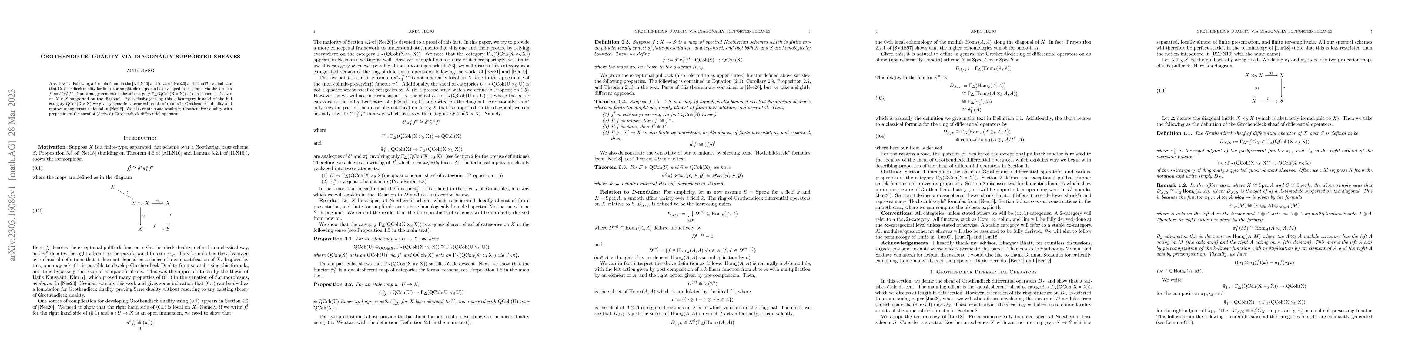 Following a formula found in the paper of Avramov, Iyengar, Lipman, and Nayak (2010) and ideas of Neeman and Khusyairi, we indicate that Grothendieck duality for finite tor-amplitude maps can be developed from scratch via the formula $f^! := \delta^*\pi_1^{\times}f^*$. Our strategy centers on the subcategory $\Gamma_{\Delta}(\mathrm{QCoh}(X \times X))$ of quasicoherent sheaves on $X \times X$ supported on the diagonal. By exclusively using this subcategory instead of the full category $\mathrm{QCoh}(X \times X)$ we give systematic categorical proofs of results in Grothendieck duality and reprove many formulas found in Neeman (2018). We also relate some results in Grothendieck duality with properties of the sheaf of (derived) Grothendieck differential operators.