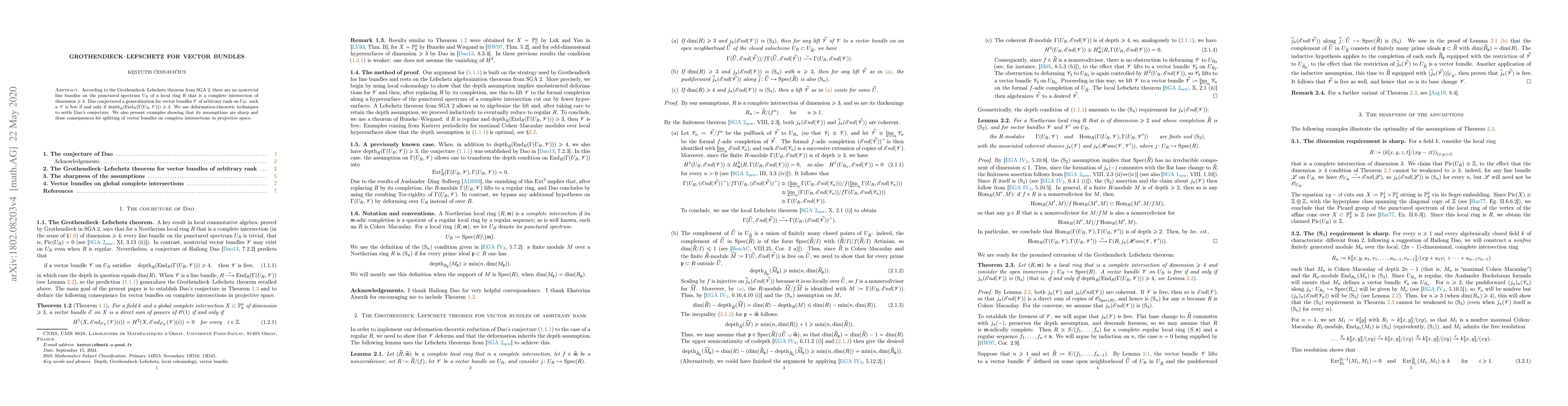 According to the Grothendieck-Lefschetz theorem from SGA 2, there are no nontrivial line bundles on the punctured spectrum $U_R$ of a local ring $R$ that is a complete intersection of dimension $\ge 4$. Dao conjectured a generalization for vector bundles $\mathscr{V}$ of arbitrary rank on $U_R$: such a $\mathscr{V}$ is free if and only if $\mathrm{depth}_R(\mathrm{End}_R(\Gamma(U_R, \mathscr{V}))) \ge 4$. We use deformation theoretic techniques to settle Dao's conjecture. We also present examples showing that its assumptions are sharp and draw consequences for splitting of vector bundles on complete intersections in projective space.