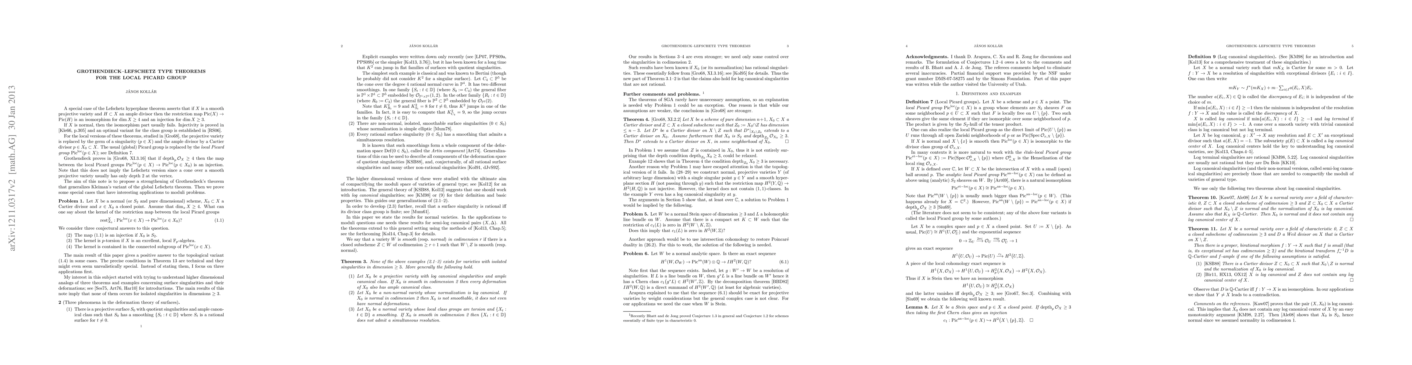 Summary: This paper strengthens the Grothendieck-Lefschetz hyperplane theorem for the local Picard group, proves selected cases, and explores implications for the deformation theory of log canonical singularities. The main conjecture has been revised based on recent findings by Bhatt and de Jong, with minor adjustments to the proofs.