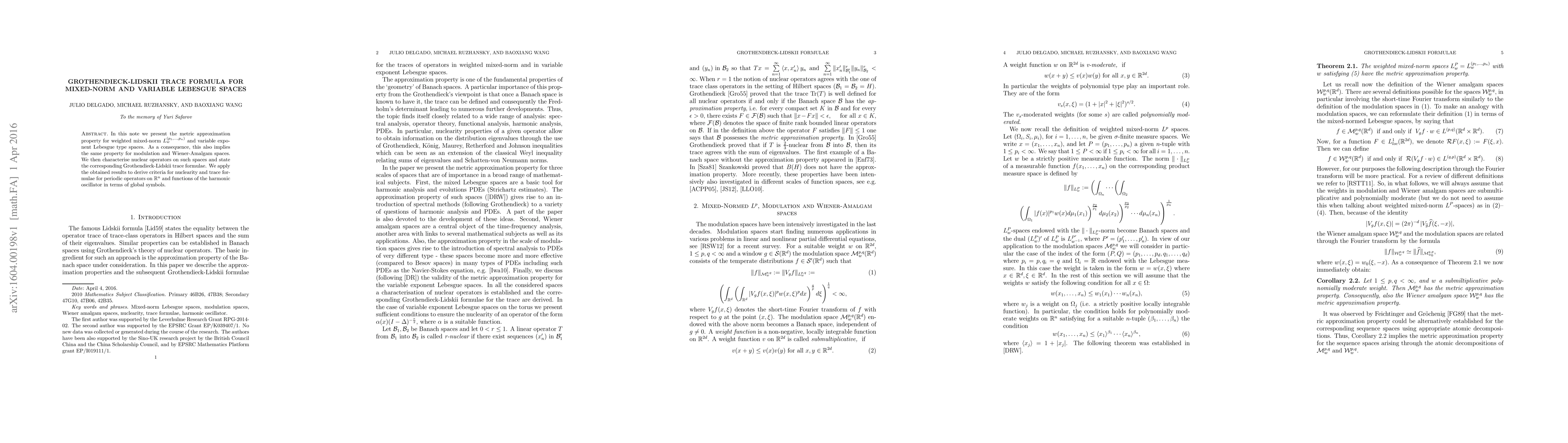 In this note we present the metric approximation property for weighted mixed-norm $L_w^{(p_1,\dots ,p_n)}$ and variable exponent Lebesgue type spaces. As a consequence, this also implies the same property for modulation and Wiener-Amalgam spaces. We then characterise nuclear operators on such spaces and state the corresponding Grothendieck-Lidskii trace formulae. We apply the obtained results to derive criteria for nuclearity and trace formulae for periodic operators on $\mathbb R^n$ and functions of the harmonic oscillator in terms of the global symbol.