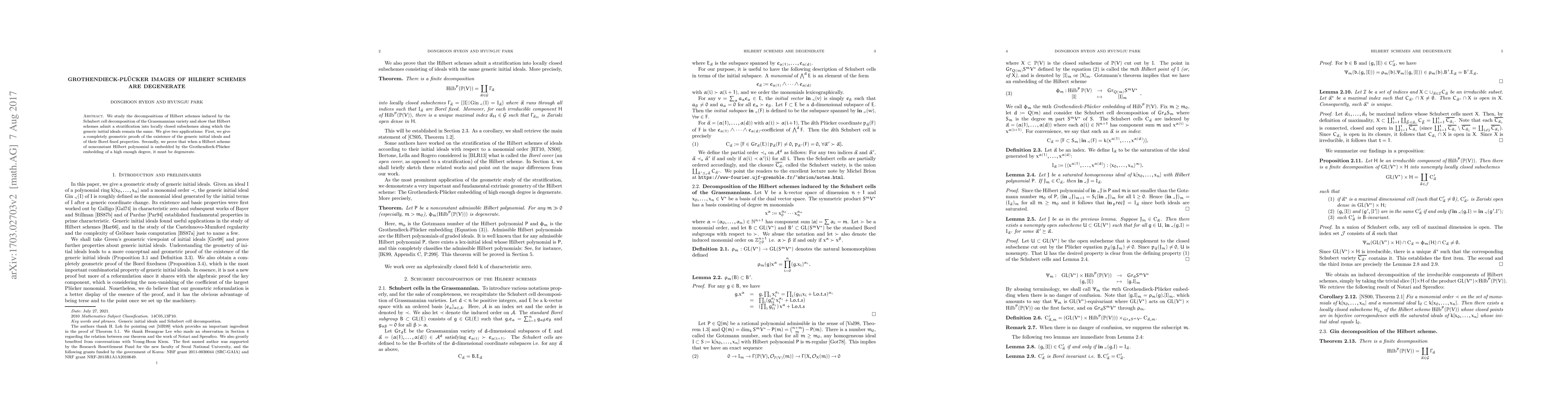 We study the decompositions of Hilbert schemes induced by the Schubert cell decomposition of the Grassmannian variety and show that Hilbert schemes admit a stratification into locally closed subschemes along which the generic initial ideals remain the same. We give two applications: First, we give a completely geometric proofs of the existence of the generic initial ideals and of their Borel fixed properties. Secondly, we prove that when a Hilbert scheme of nonconstant Hilbert polynomial is embedded by the Grothendieck-Pl\"ucker embedding of a high enough degree, it must be degenerate.