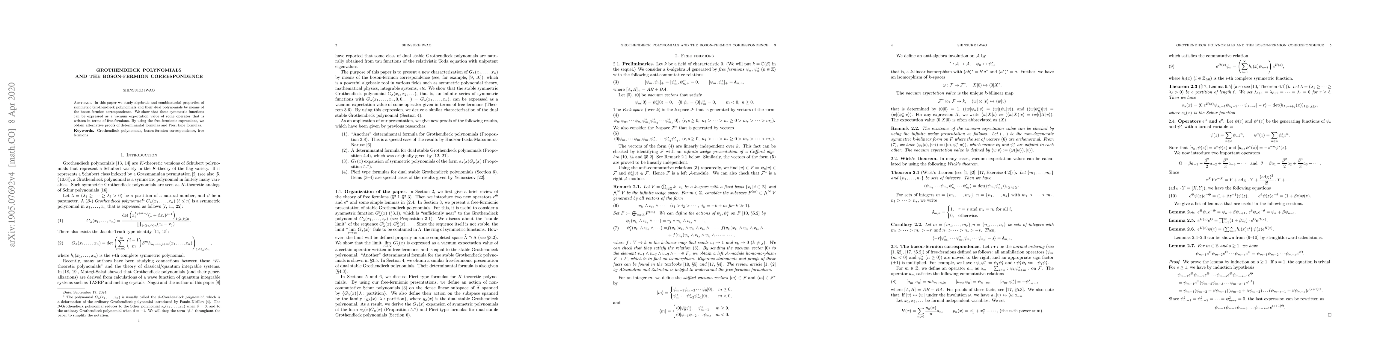 Summary: This paper explores the algebraic and combinatorial properties of Grothendieck polynomials via the Boson-Fermion correspondence, showing they correspond to vacuum expectation values of free-fermion operators, and provides new proofs for determinantal and Pieri formulas.