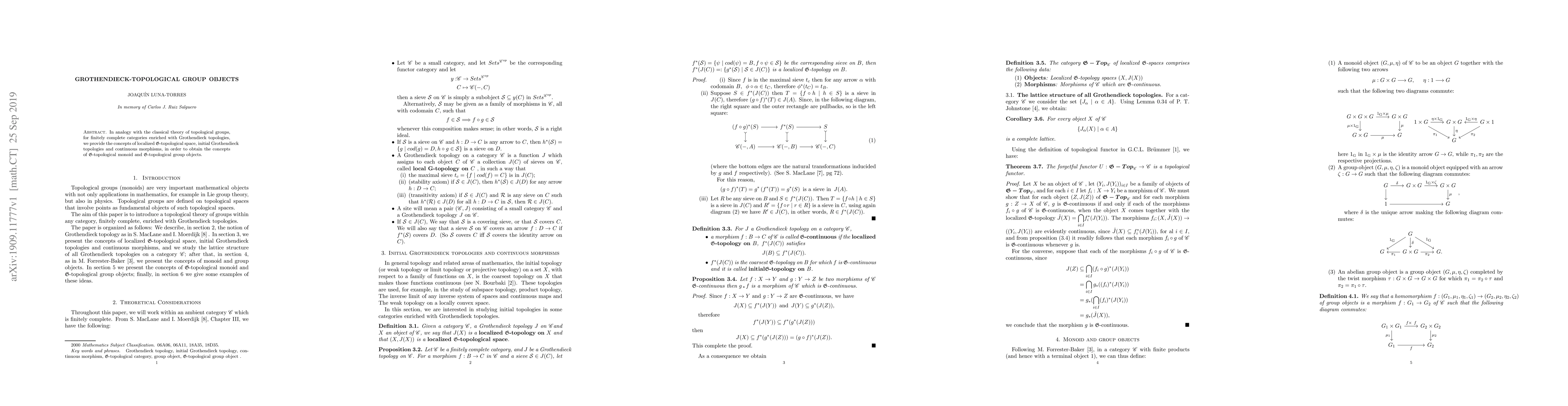 Researchers develop concepts for G-topological group objects in finitely complete categories with Grothendieck topologies, providing a framework for studying continuous morphisms and initial topologies.