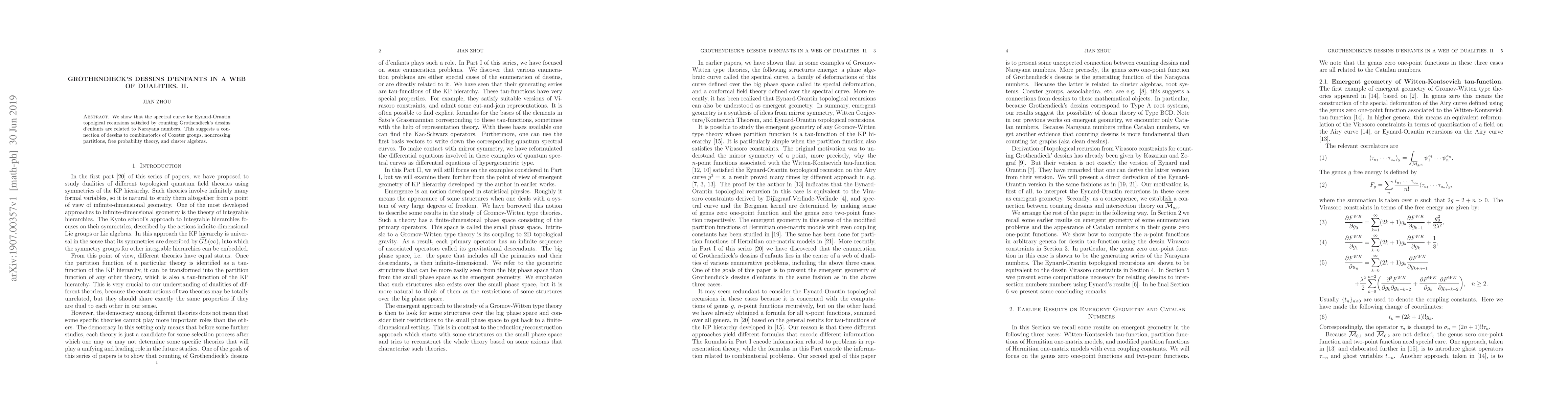 This paper demonstrates a link between the spectral curves arising from Eynard-Orantin topological recursions for counting Grothendieck's dessins d'enfants and Narayana numbers, revealing connections to Coxeter groups, noncrossing partitions, free probability theory, and cluster algebras.