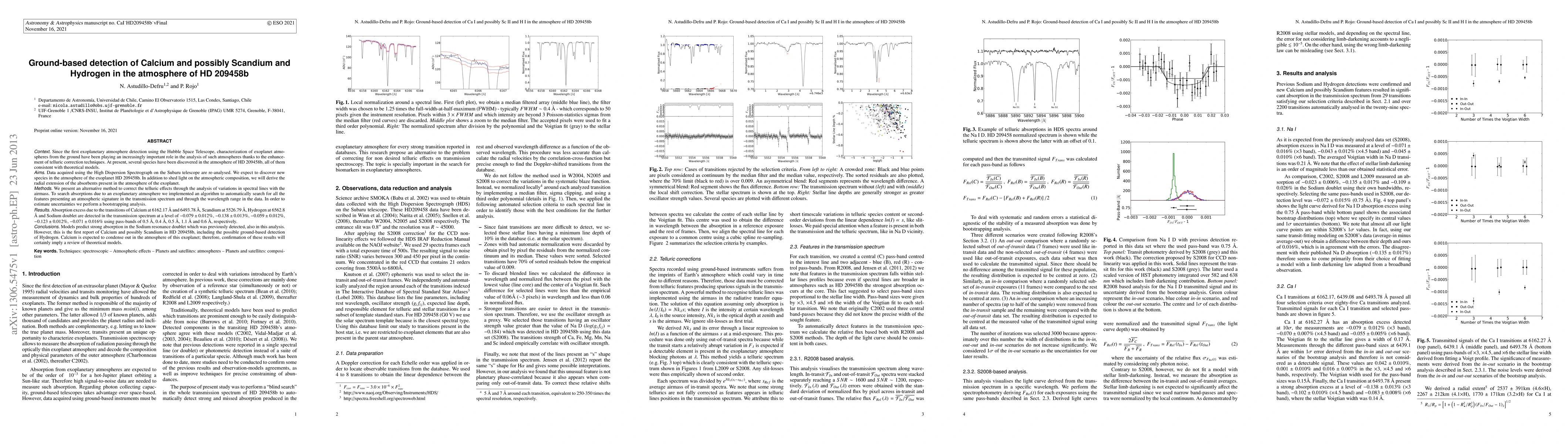 Context: Since the first exoplanetary atmosphere detection using the Hubble Space Telescope, characterization of exoplanet atmospheres from the ground have been playing an increasingly important role in the analysis of such atmospheres thanks to the enhancement of telluric correction techniques. At present, several species have been discovered in the atmosphere of HD 209458b, all of them consistent with theoretical models. Aims: Data acquired using the High Dispersion Spectrograph on the Subaru telescope are re-analysed. We expect to discover new species in the atmosphere of the exoplanet HD 209458b. In addition to shed light on the atmospheric composition, we will derive the radial extension of the absorbents present in the atmosphere of the exoplanet. Methods: We present an alternative method to correct the telluric effects through the analysis of variations in spectral lines with the airmass. To search absorptions due to an exoplanetary atmosphere we implemented an algorithm to automatically search for all the features presenting an atmospheric signature in the transmission spectrum and through the wavelength range in the data. In order to estimate uncertainties we perform a bootstrapping analysis. Results: Absorption excess due to the transitions of Calcium at 6162.17A and 6493.78A, Scandium at 5526.79A, Hydrogen at 6562.8A and Sodium doublet are detected in the transmission spectrum at a level of -0.079+-0.012%, -0.138+-0.013%, -0.059+-0.012%, -0.123+-0.012%, -0.071+-0.016% using pass-bands of 0.5A, 0.4A, 0.5A, 1.1A and 0.6A, respectively. Conclusions: Models predict strong absorption in the Sodium resonance Doublet which was previously detected, also in this analysis. However, this is the first report of Calcium and possibly Scandium in HD 209458b, including the possible ground-based detection of Hydrogen. ... (continues)