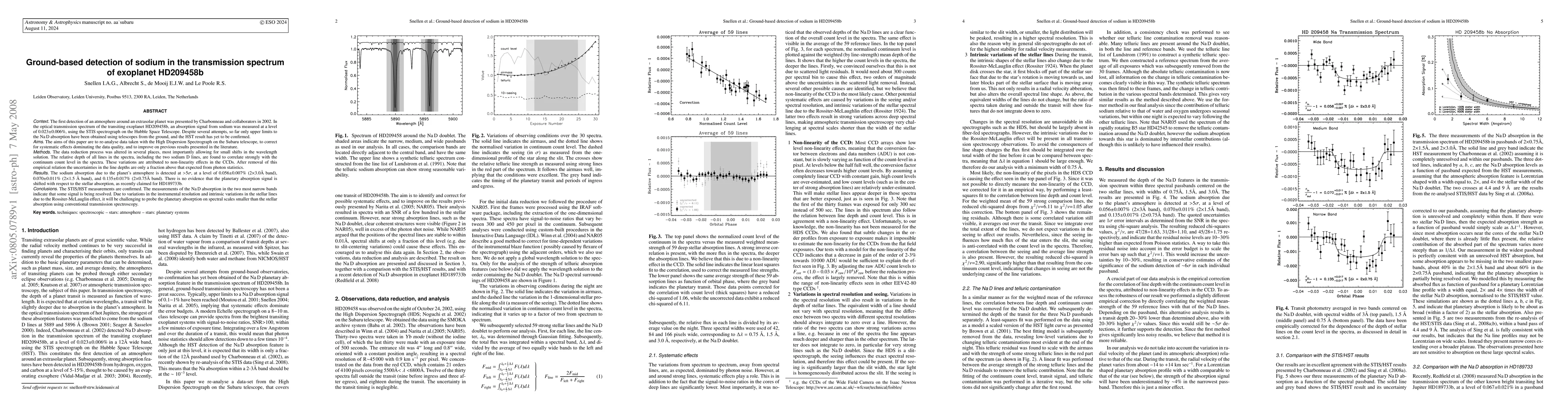 Researchers detected sodium in the atmosphere of exoplanet HD209458b using ground-based spectroscopy, finding absorption signals at multiple wavelengths with high accuracy.