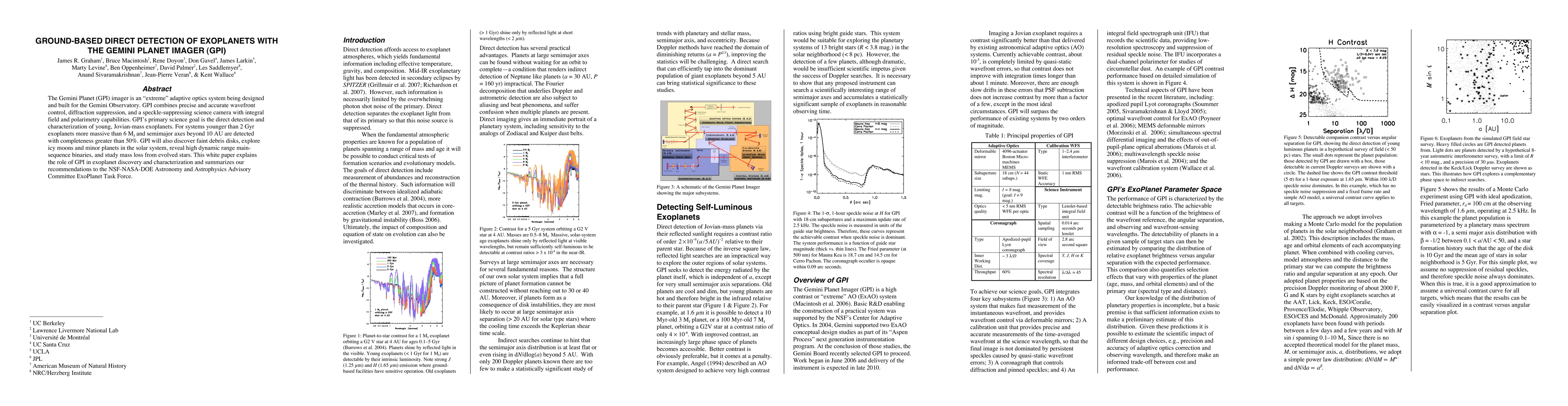The Gemini Planet Imager (GPI) is an advanced adaptive optics system designed for the Gemini Observatory to directly detect and characterize young, massive exoplanets. GPI aims to achieve high detection rates for exoplanets more than 6 times the mass of Jupiter, beyond 10 AU from their host stars, and younger than 2 billion years.
