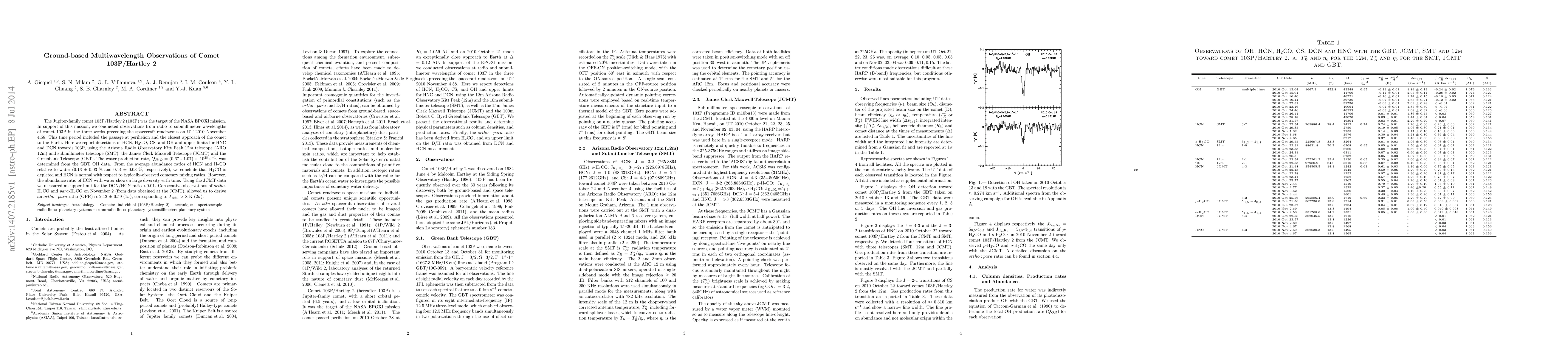 The Jupiter-family comet 103P/Hartley 2 (103P) was the target of the NASA EPOXI mission. In support of this mission, we conducted observations from radio to submillimeter wavelengths of comet 103P in the three weeks preceding the spacecraft rendezvous on UT 2010 November 4.58. This time period included the passage at perihelion and the closest approach of the comet to the Earth. Here we report detections of HCN, H2CO, CS, and OH and upper limits for HNC and DCN towards 103P, using the Arizona Radio Observatory Kitt Peak 12m telescope (ARO 12m) and submillimeter telescope (SMT), the James Clerk Maxwell Telescope (JCMT) and the Greenbank Telescope (GBT). The water production rate, QH2O = (0.67 - 1.07) x 10^28 s^-1, was determined from the GBT OH data. From the average abundance ratios of HCN and H2CO relative to water (0.13 +/- 0.03 % and 0.14 +/- 0.03 %, respectively), we conclude that H2CO is depleted and HCN is normal with respect to typically-observed cometary mixing ratios. However, the abundance ratio of HCN with water shows a large diversity with time. Using the JCMT data we measured an upper limit for the DCN/HCN ratio <0.01. Consecutive observations of ortho- H2CO and para-H2CO on November 2 (from data obtained at the JCMT), allowed us to derive an ortho : para ratio (OPR) ~ 2.12 +/- 0.59 (1sigma), corresponding to Tspin > 8 K (2sigma).