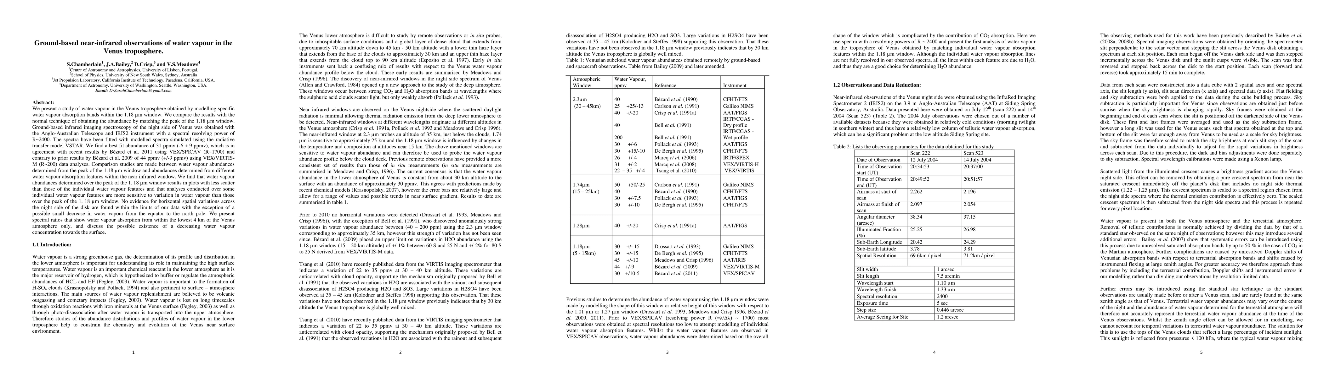 This study uses ground-based near-infrared observations to determine water vapour in Venus' troposphere, finding an abundance of 31 ppmv (-6 + 9 ppmv) through fitting modelled spectra. The results show less scatter when compared to the peak of the 1.18 μm window rather than individual absorption features, indicating higher sensitivity of the latter.