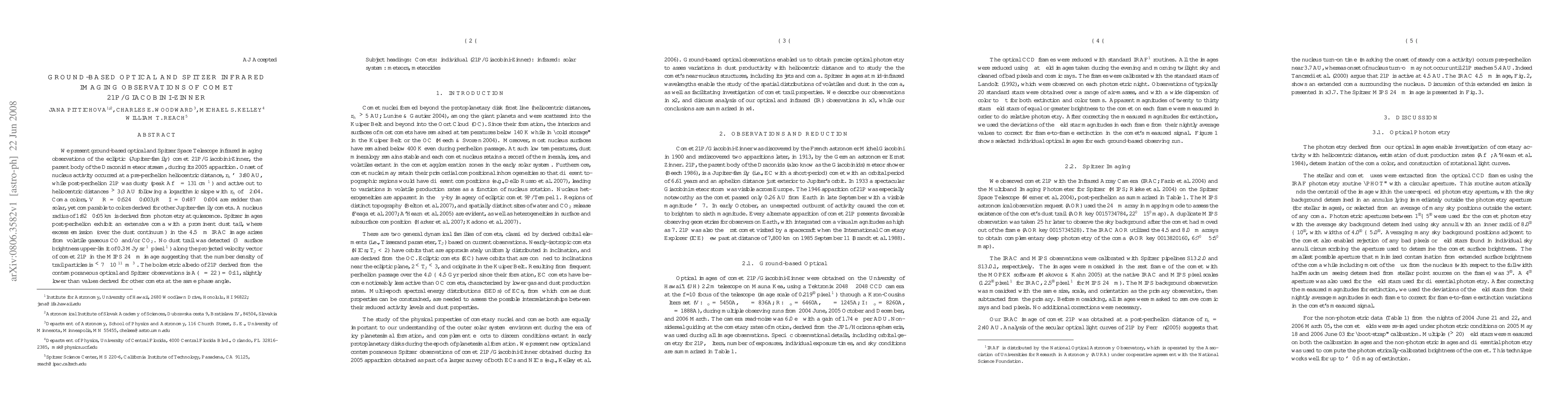 Comet 21P/Giacobini-Zinner was observed to have a reddish coma color, a dusty nucleus with a low albedo, and a prominent dust tail with excess emission from CO and CO2 gases.