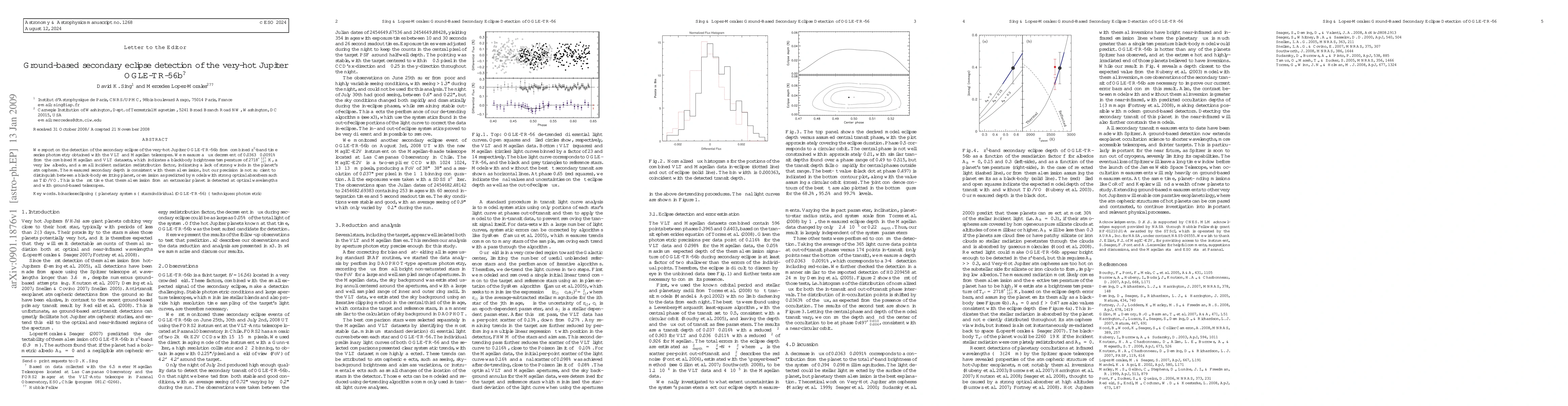 This paper reports the first detection of the secondary eclipse of the very-hot Jupiter OGLE-TR-56b using ground-based telescopes, revealing a flux decrement indicative of a low albedo and minimal atmospheric wind. The findings suggest thermal emission consistent with a blackbody, though precise models remain inconclusive.