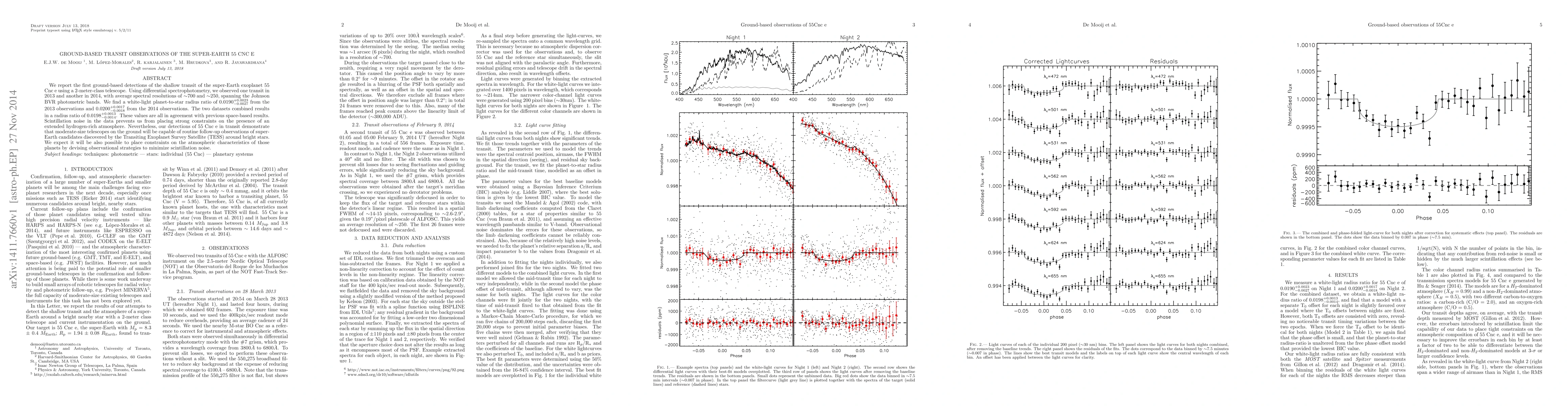 We report the first ground-based detections of the shallow transit of the super-Earth exoplanet 55 Cnc e using a 2-meter-class telescope. Using differential spectrophotometry, we observed one transit in 2013 and another in 2014, with average spectral resolutions of ~700 and ~250, spanning the Johnson BVR photometric bands. We find a white-light planet-to-star radius ratio of 0.0190 -0.0027+0.0023 from the 2013 observations and 0.0200 -0.0018+0.0017 from the 2014 observations. The two datasets combined results in a radius ratio of 0.0198 -0.0014+0.0013. These values are all in agreement with previous space-based results. Scintillation noise in the data prevents us from placing strong constraints on the presence of an extended hydrogen-rich atmosphere. Nevertheless, our detections of 55 Cnc e in transit demonstrate that moderate-size telescopes on the ground will be capable of routine follow-up observations of super-Earth candidates discovered by the Transiting Exoplanet Survey Satellite (TESS) around bright stars. We expect it will be also possible to place constraints on the atmospheric characteristics of those planets by devising observational strategies to minimize scintillation noise.