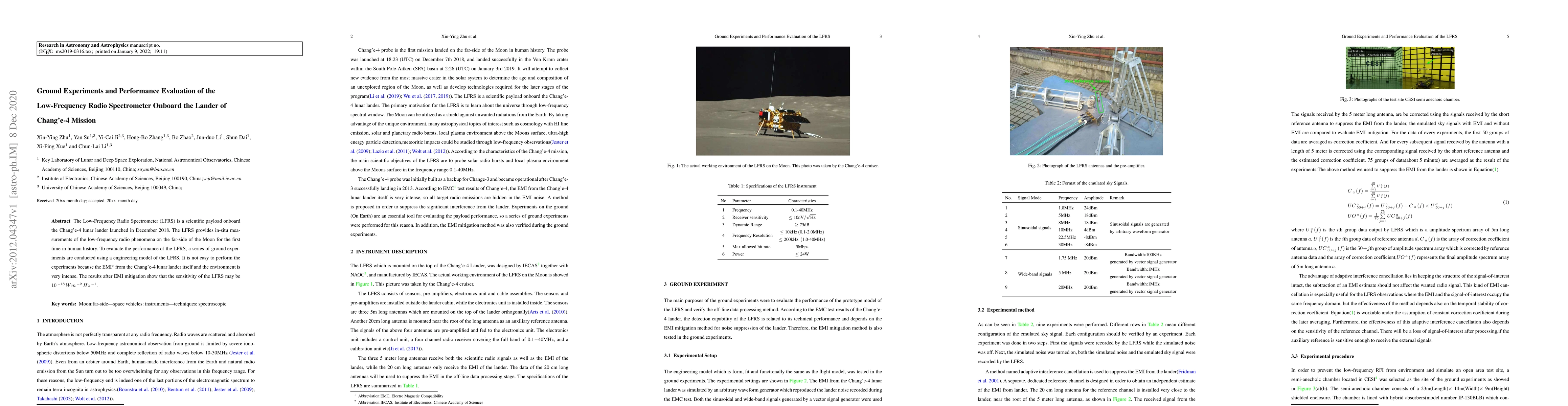 The Low-Frequency Radio Spectrometer (LFRS) on the Chang'e-4 lunar lander measures low-frequency radio phenomena on the Moon's far-side. Ground experiments with a prototype LFRS, despite intense electromagnetic interference, indicate a sensitivity of 1e-18Wm^2Hz^-1.
