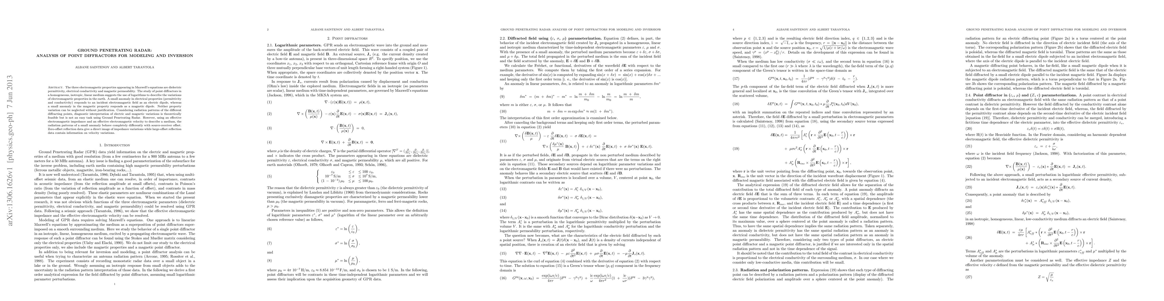 This paper explores the use of point diffractors in modeling and inversion for Ground Penetrating Radar (GPR) analysis. It highlights the importance of electromagnetic properties like dielectric permittivity and electrical conductivity in interpreting GPR data, emphasizing the distinct radiation patterns of electric and magnetic dipoles.