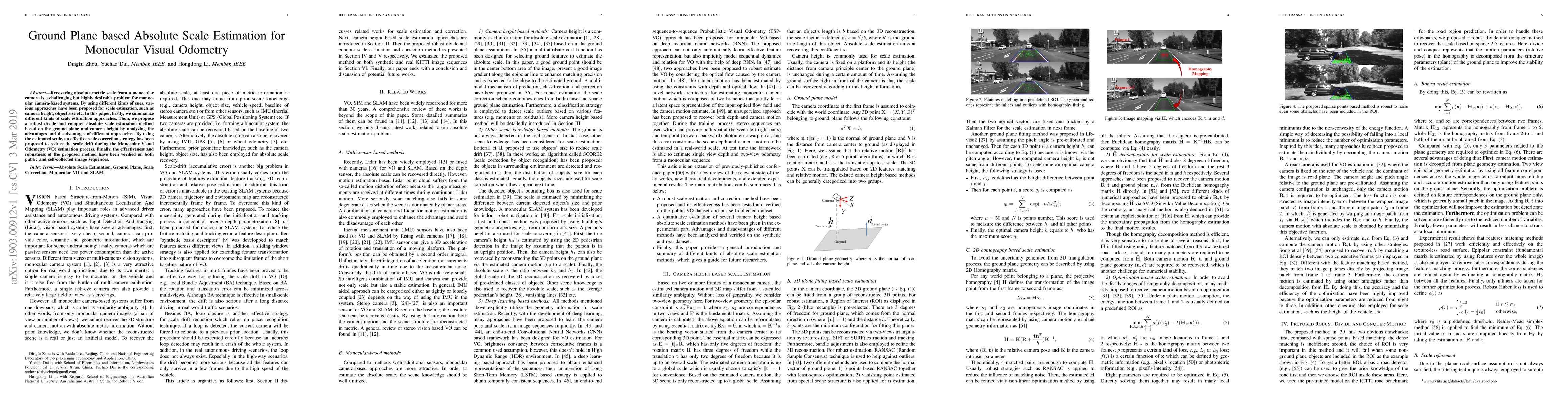 This paper proposes a robust method for estimating the absolute scale in monocular visual odometry using ground plane analysis and camera height. It introduces a divide and conquer strategy to correct scale drift and validates the method's effectiveness through experiments on both public and self-collected datasets.