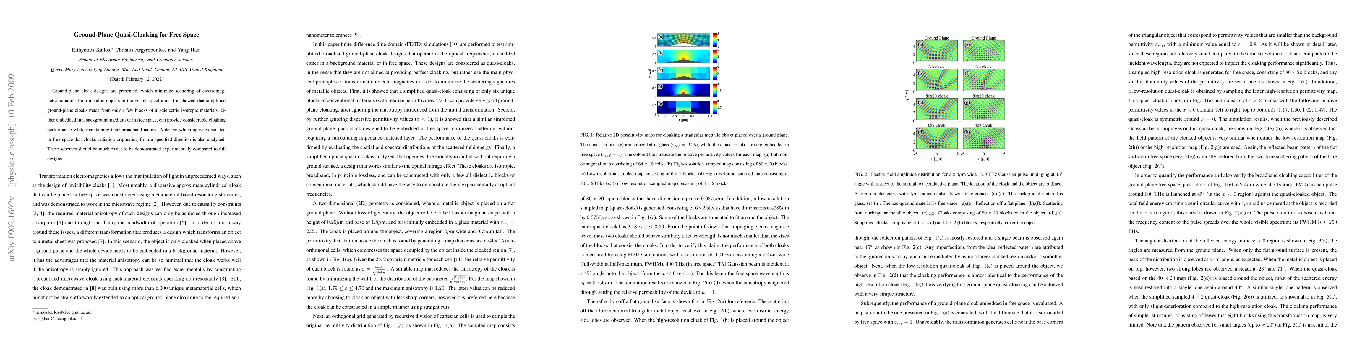 Ground-plane cloak designs are presented, which minimize scattering of electromagnetic radiation from metallic objects in the visible spectrum. It is showed that simplified ground-plane cloaks made from only a few blocks of all-dielectric isotropic materials, either embedded in a background medium or in free space, can provide considerable cloaking performance while maintaining their broadband nature. A design which operates isolated in free space that cloaks radiation originating from a specified direction is also analyzed. These schemes should be much easier to be demonstrated experimentally compared to full designs.