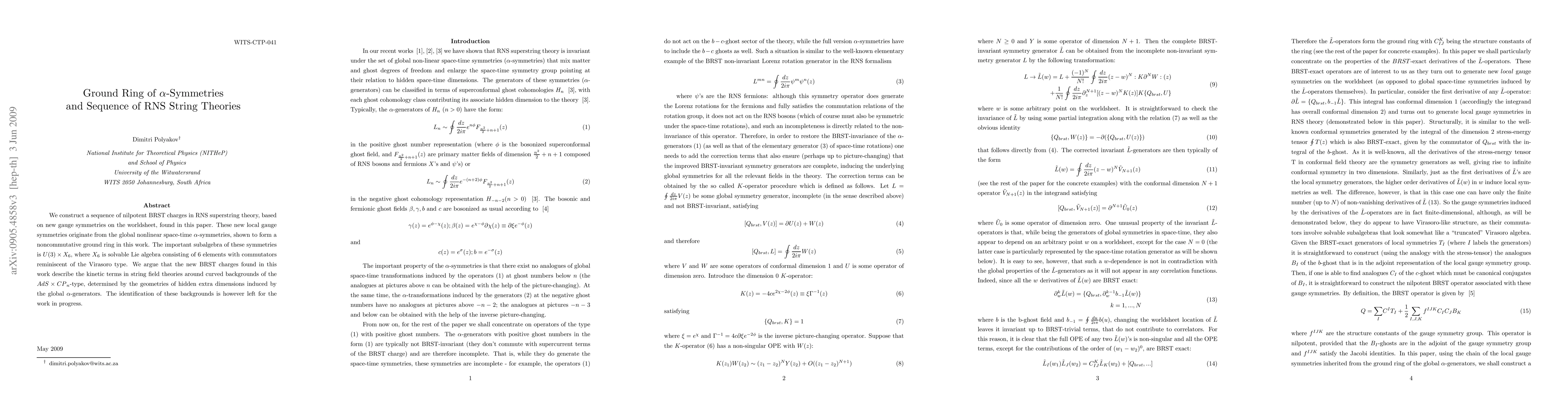 We construct a sequence of nilpotent BRST charges in RNS superstring theory, based on new gauge symmetries on the worldsheet, found in this paper. These new local gauge symmetries originate from the global nonlinear space-time $\alpha$-symmetries, shown to form a noncommutative ground ring in this work. The important subalgebra of these symmetries is $U(3)\times{X_6}$, where $X_6$ is solvable Lie algebra consisting of 6 elements with commutators reminiscent of the Virasoro type. We argue that the new BRST charges found in this work describe the kinetic terms in string field theories around curved backgrounds of the $AdS\times{CP}_n$-type, determined by the geometries of hidden extra dimensions induced by the global $\alpha$-generators. The identification of these backgrounds is however left for the work in progress.