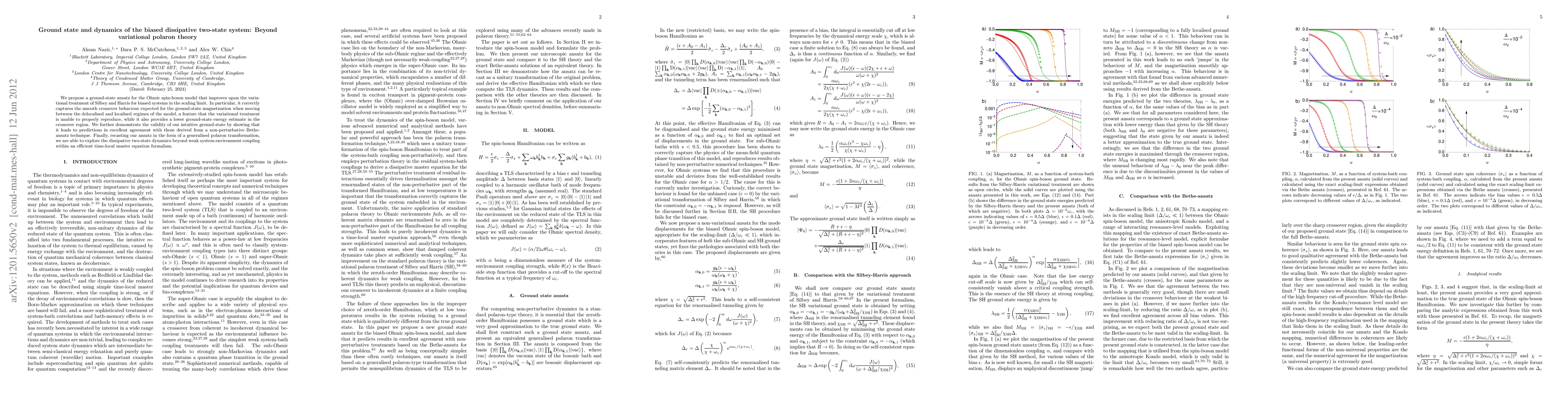This paper proposes a new ground-state ansatz for the Ohmic spin-boson model that surpasses the variational polaron theory for biased systems, accurately capturing the crossover behavior in magnetisation and providing a lower energy estimate. It also demonstrates agreement with non-perturbative predictions and extends the analysis to dissipative two-state dynamics using a master equation formalism.