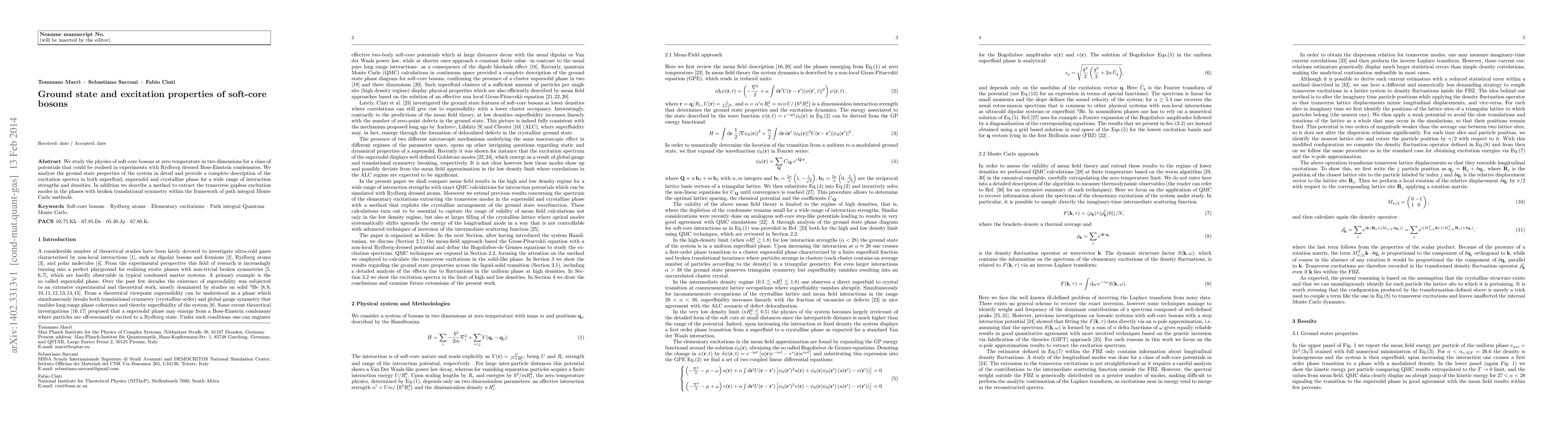 The novelty of this work lies in its detailed analysis of ground state properties and excitation spectra in various phases, coupled with the development of a method to extract transverse gapless excitation modes in phases with broken translational symmetry, providing a comprehensive understanding of soft-core boson systems.