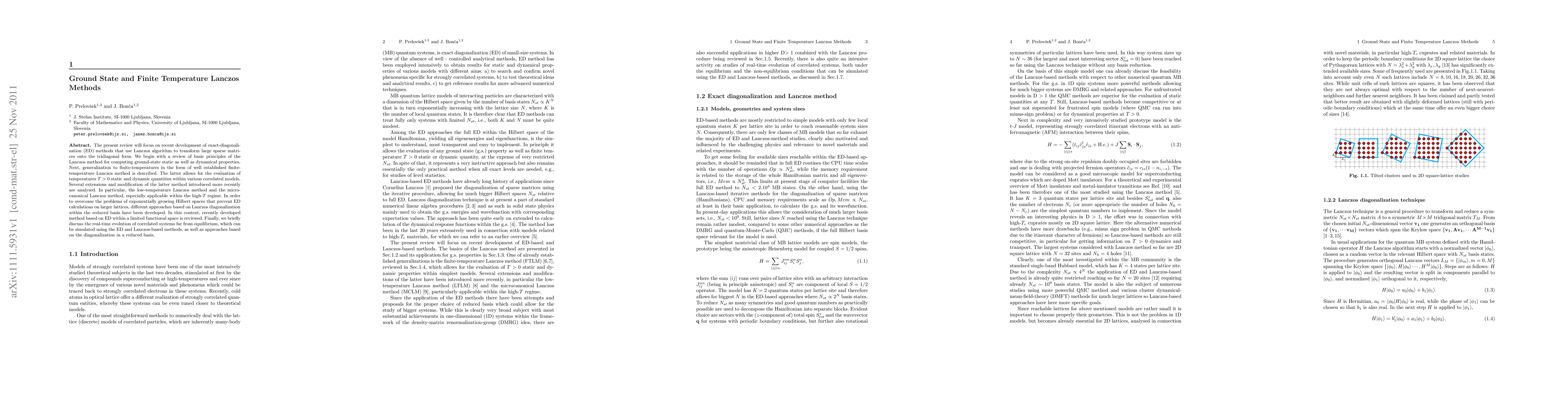 The present review will focus on recent development of exact-diagonali- zation (ED) methods that use Lanczos algorithm to transform large sparse matrices onto the tridiagonal form. We begin with a review of basic principles of the Lanczos method for computing ground-state static as well as dynamical properties. Next, generalization to finite-temperatures in the form of well established finite-temperature Lanczos method is described. The latter allows for the evaluation of temperatures T>0 static and dynamic quantities within various correlated models. Several extensions and modification of the latter method introduced more recently are analysed. In particular, the low-temperature Lanczos method and the microcanonical Lanczos method, especially applicable within the high-T regime. In order to overcome the problems of exponentially growing Hilbert spaces that prevent ED calculations on larger lattices, different approaches based on Lanczos diagonalization within the reduced basis have been developed. In this context, recently developed method based on ED within a limited functional space is reviewed. Finally, we briefly discuss the real-time evolution of correlated systems far from equilibrium, which can be simulated using the ED and Lanczos-based methods, as well as approaches based on the diagonalization in a reduced basis.