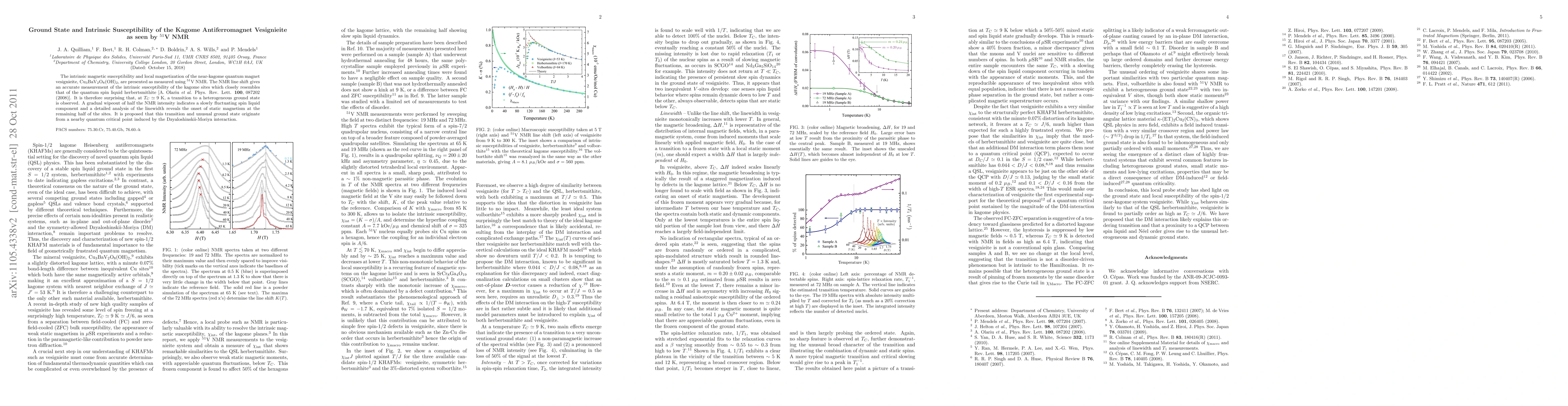 This study uses 51V NMR to measure the intrinsic magnetic susceptibility and local magnetization of vesignieite, a near-kagome quantum magnet, revealing a transition to a heterogeneous ground state at Tc ~ 9 K, despite its similarity to the quantum spin liquid herbertsmithite. The transition is proposed to be driven by a Dzyaloshinskii-Moriya interaction near a quantum critical point.