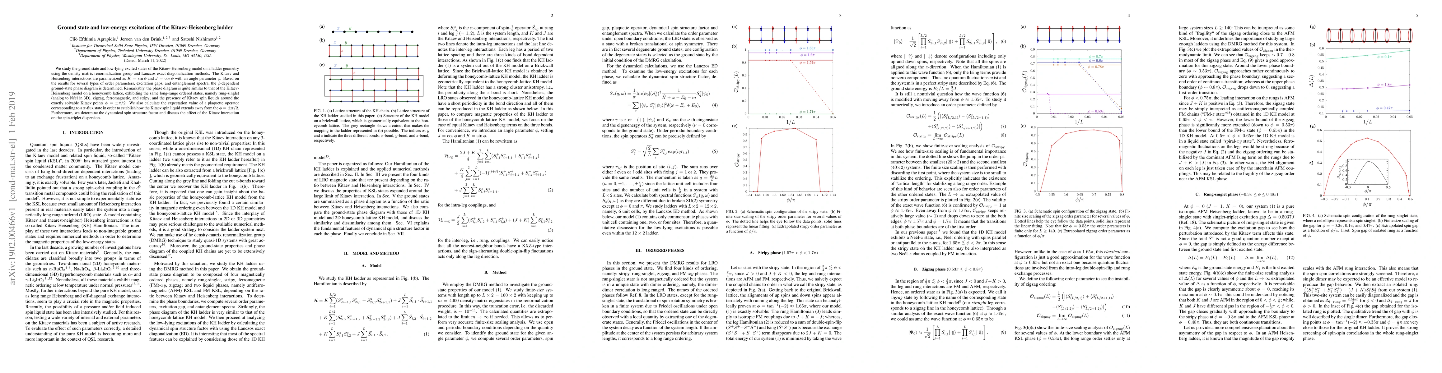 This research investigates the ground state and low-energy excitations of the Kitaev-Heisenberg model on a ladder using density matrix renormalization and Lanczos methods, revealing a $\phi$-dependent phase diagram similar to that on a honeycomb lattice, including Kitaev spin liquids and various ordered states. It also examines the influence of the Kitaev interaction on spin-triplet dispersion.