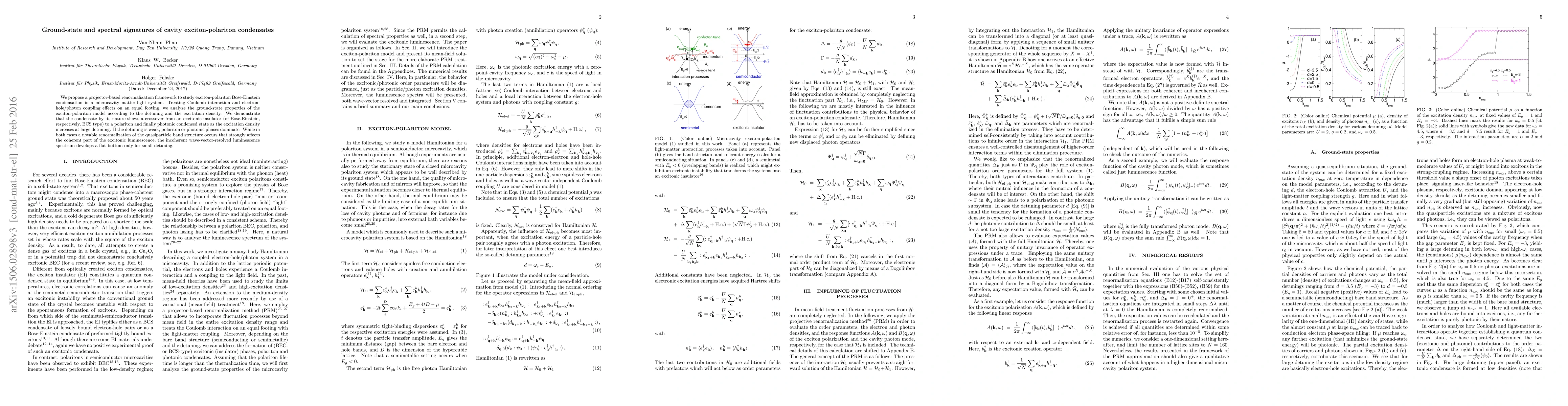 We propose a projector-based renormalization framework to study exciton-polariton Bose-Einstein condensation in a microcavity matter-light system. Treating Coulomb interaction and electron-hole/photon coupling effects on an equal footing we analyze the ground-state properties of the exciton polariton model according to the detuning and the excitation density. We demonstrate that the condensate by its nature shows a crossover from an excitonic insulator (of Bose-Einstein respectively BCS type) to a polariton and finally photonic condensed state as the excitation density increases at large detuning. If the detuning is weak polariton or photonic phases dominate. While in both cases a notable renormalization of the quasiparticle band structure occurs that strongly affects the coherent part of the excitonic luminescence, the incoherent wavevector-resolved luminescence spectrum develops a flat bottom only for small detuning.