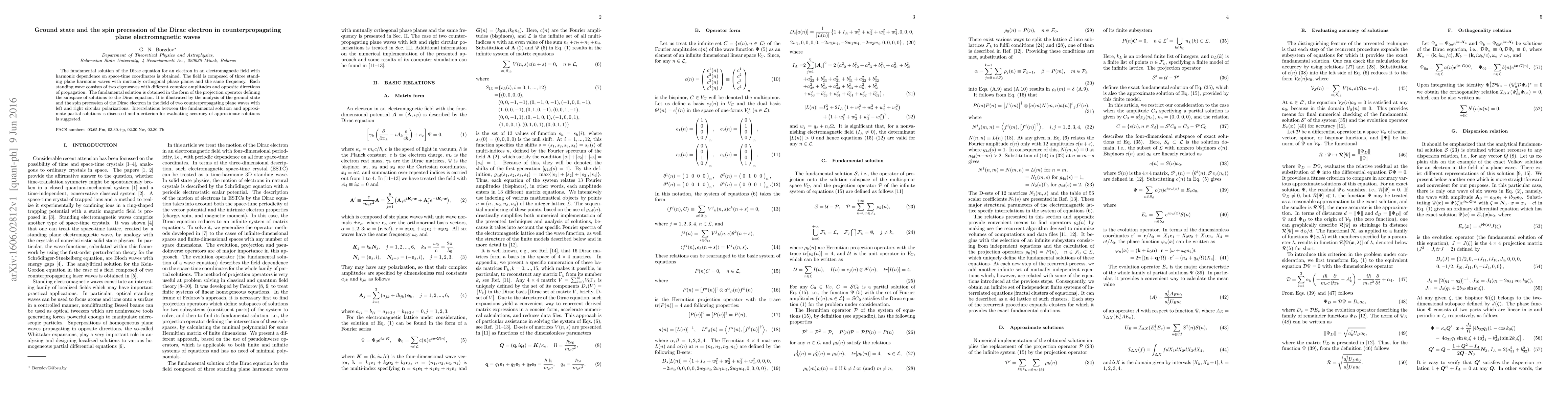 The fundamental solution of the Dirac equation for an electron in an electromagnetic field with harmonic dependence on space-time coordinates is obtained. The field is composed of three standing plane harmonic waves with mutually orthogonal phase planes and the same frequency. Each standing wave consists of two eigenwaves with different complex amplitudes and opposite directions of propagation. The fundamental solution is obtained in the form of the projection operator defining the subspace of solutions to the Dirac equation. It is illustrated by the analysis of the ground state and the spin precession of the Dirac electron in the field of two counterpropagating plane waves with left and right circular polarizations. Interrelations between the fundamental solution and approximate partial solutions is discussed and a criterion for evaluating accuracy of approximate solutions is suggested.