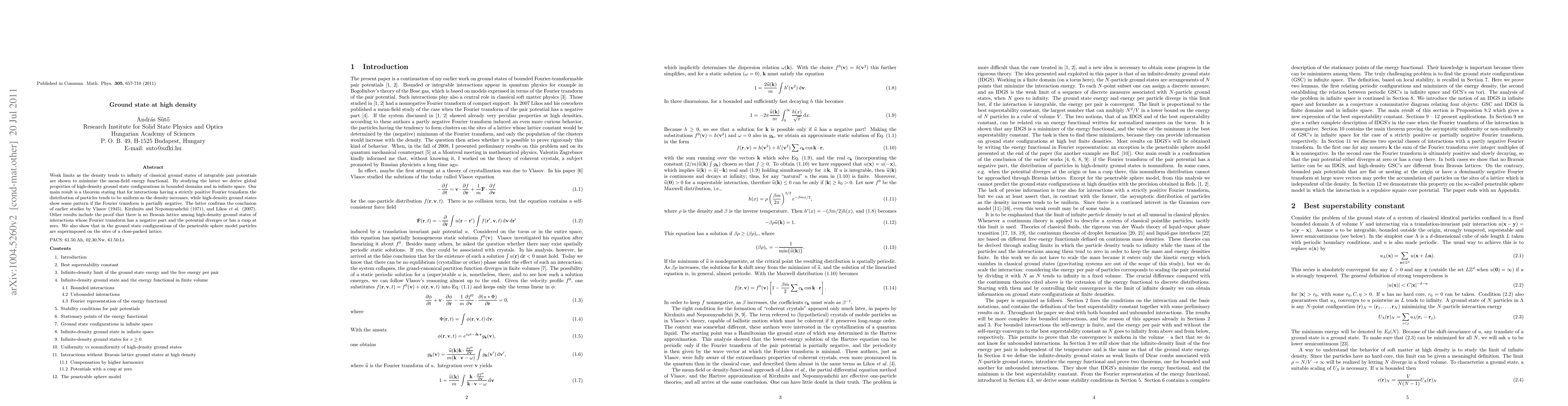 Weak limits as the density tends to infinity of classical ground states of integrable pair potentials are shown to minimize the mean-field energy functional. By studying the latter we derive global properties of high-density ground state configurations in bounded domains and in infinite space. Our main result is a theorem stating that for interactions having a strictly positive Fourier transform the distribution of particles tends to be uniform as the density increases, while high-density ground states show some pattern if the Fourier transform is partially negative. The latter confirms the conclusion of earlier studies by Vlasov (1945), Kirzhnits and Nepomnyashchii (1971), and Likos et al. (2007). Other results include the proof that there is no Bravais lattice among high-density ground states of interactions whose Fourier transform has a negative part and the potential diverges or has a cusp at zero. We also show that in the ground state configurations of the penetrable sphere model particles are superposed on the sites of a close-packed lattice.