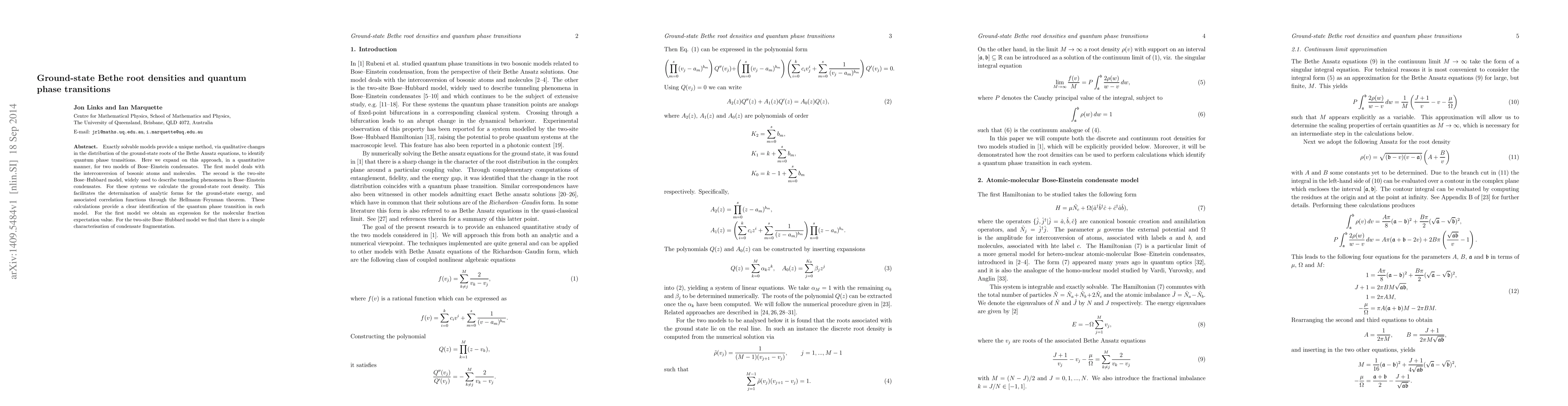This paper quantitatively analyzes ground-state Bethe root densities in exactly solvable models to identify quantum phase transitions in Bose-Einstein condensates, specifically for interconversion models and the two-site Bose-Hubbard model, revealing analytic forms for ground-state energy and correlation functions.
