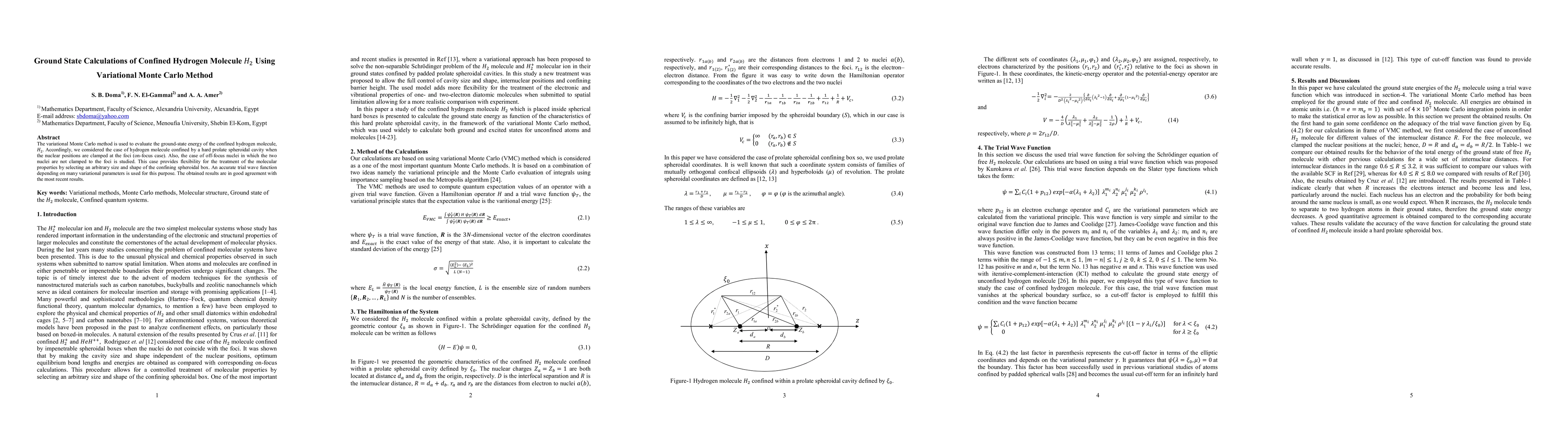 This study employs the variational Monte Carlo method to calculate the ground-state energy of a confined hydrogen molecule, H_2, within a hard prolate spheroidal cavity, examining both on-focus and off-focus nuclear positions. The results align well with recent findings, showcasing the method's accuracy.