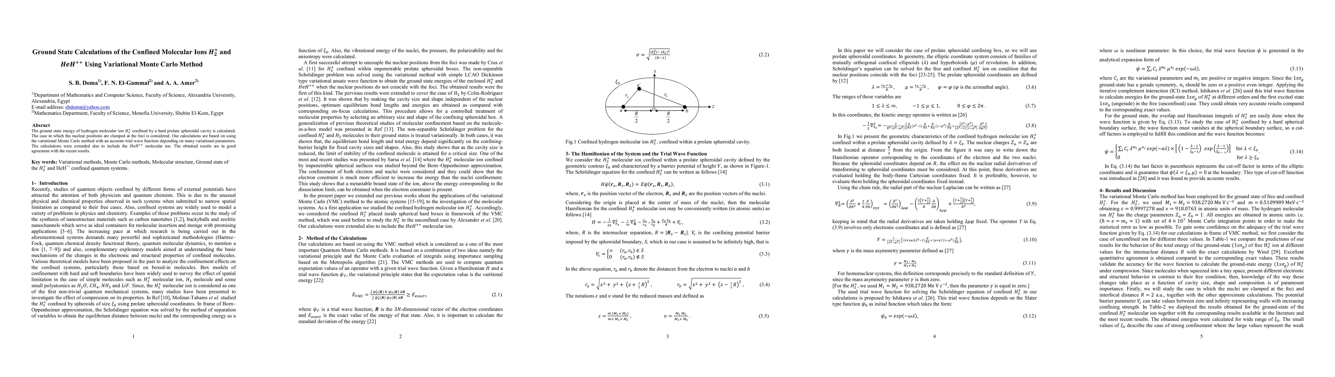 This paper uses the variational Monte Carlo method to calculate the ground state energy of H2+ and HeH++ molecular ions confined within a hard prolate spheroidal cavity, with nuclear positions fixed at the foci. The results align well with recent findings.
