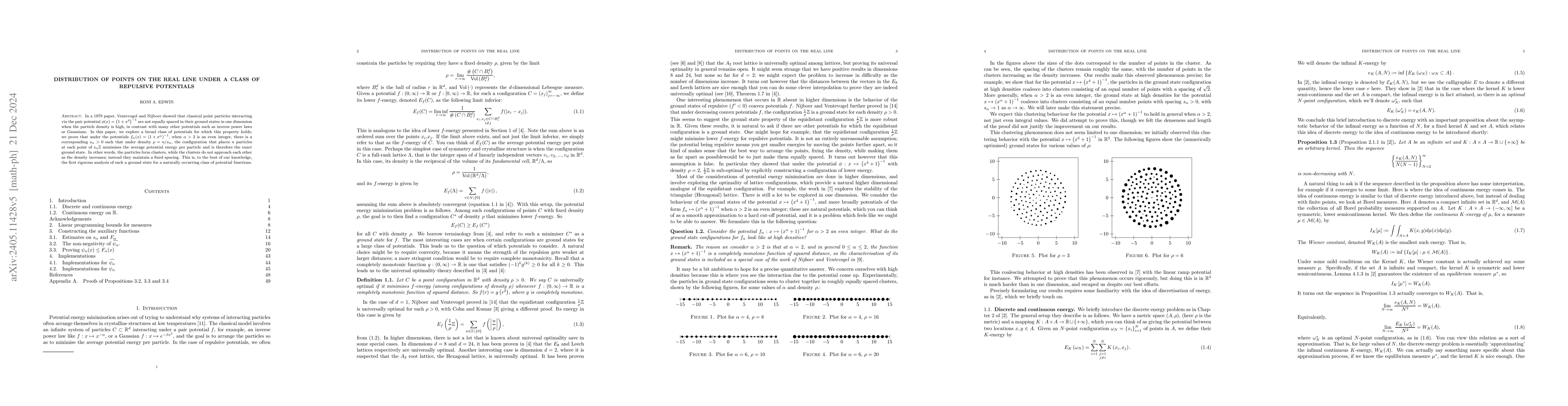 This paper rigorously proves that particles interacting via the potential $\phi(x)=\left(1+x^4\right)^{-1}$ arrange in clusters along the line with fixed spacing in their ground state at a specific high density, contrasting with equally spaced arrangements in lower densities. This analysis extends to potentials of the form $f_\alpha(x)=\left(1+x^\alpha\right)^{-1}$ for $\alpha>2$.
