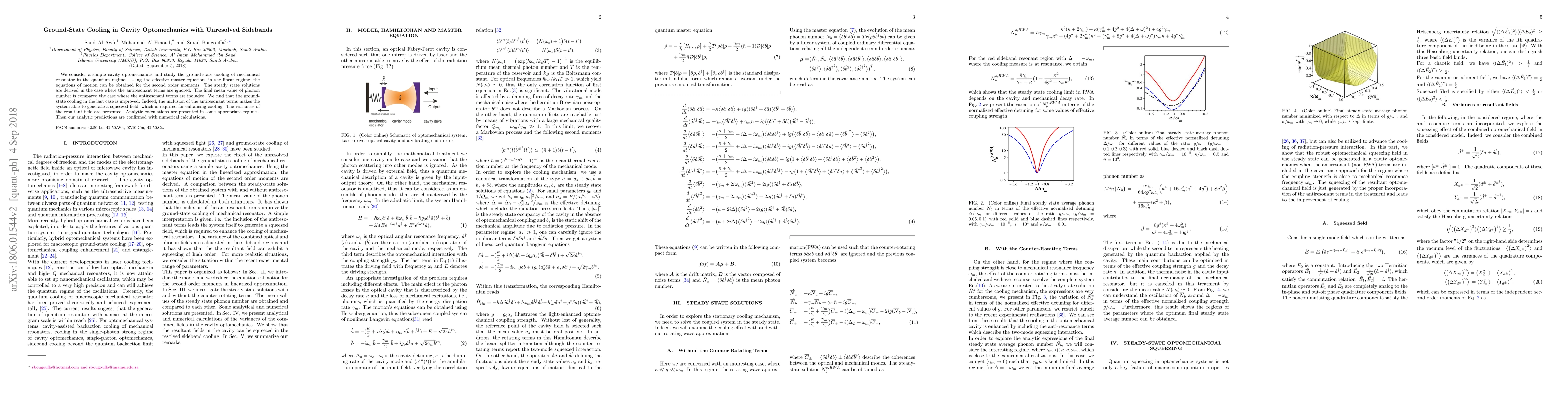 We consider a simple cavity optomechanics and study the ground-state cooling of mechanical resonator in the quantum regime. Using the effective master equations in the linear regime, the equations of motion can be obtained for the second order moments. The steady state solutions are derived in the case where the antiresonant terms are ignored. The final mean value of phonon number is compared to the case where the antiresonant terms are included. We find that the ground-state cooling in the last case is improved. Indeed, the inclusion of the antiresonant terms makes the system able to generate a squeezed field, which is required for enhancing cooling. The variances of the resultant field are presented. Analytic calculations are presented in some appropriate regimes. Then our analytic predictions are confirmed with numerical calculations.