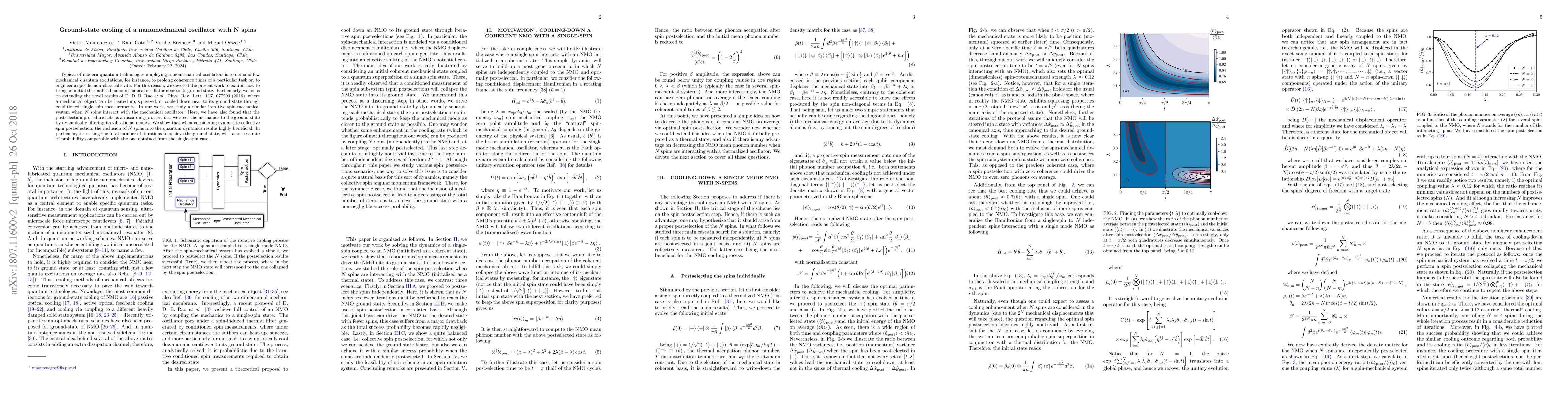 This research demonstrates how to cool a nanomechanical oscillator to near its ground state using an iterative spin-mechanical system with $N$ interacting spins. The study finds that symmetric collective spin postselection significantly reduces the number of iterations needed, achieving ground-state cooling with a success rate comparable to the single-spin case.