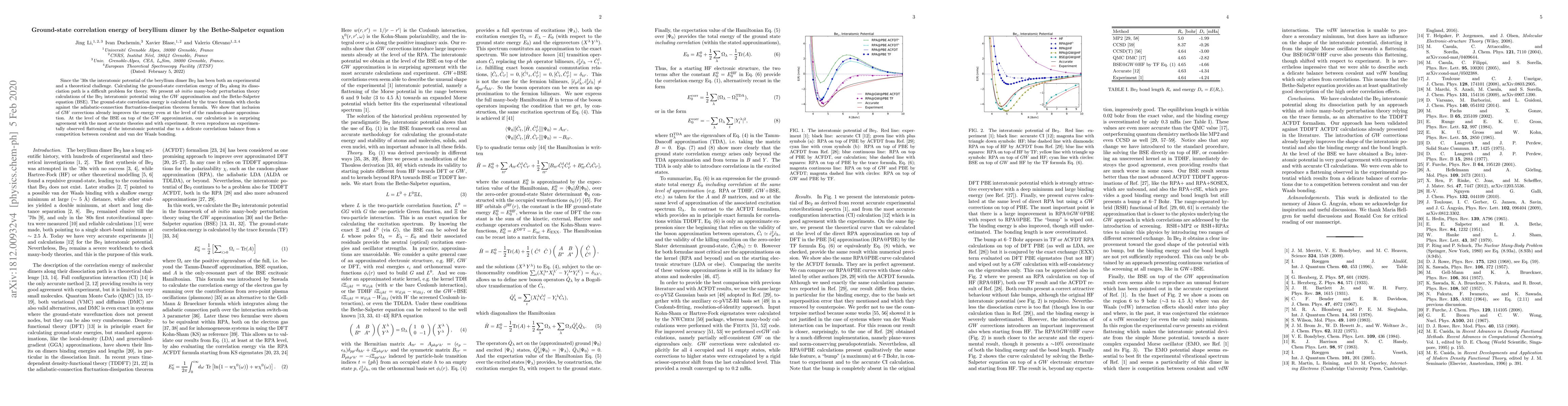 Since the '30s the interatomic potential of the beryllium dimer Be$_2$ has been both an experimental and a theoretical challenge. Calculating the ground-state correlation energy of Be$_2$ along its dissociation path is a difficult problem for theory. We present ab initio many-body perturbation theory calculations of the Be$_2$ interatomic potential using the GW approximation and the Bethe-Salpeter equation (BSE). The ground-state correlation energy is calculated by the trace formula with checks against the adiabatic-connection fluctuation-dissipation theorem formula. We show that inclusion of GW corrections already improves the energy even at the level of the random-phase approximation. At the level of the BSE on top of the GW approximation, our calculation is in surprising agreement with the most accurate theories and with experiment. It even reproduces an experimentally observed flattening of the interatomic potential due to a delicate correlations balance from a competition between covalent and van der Waals bonding.