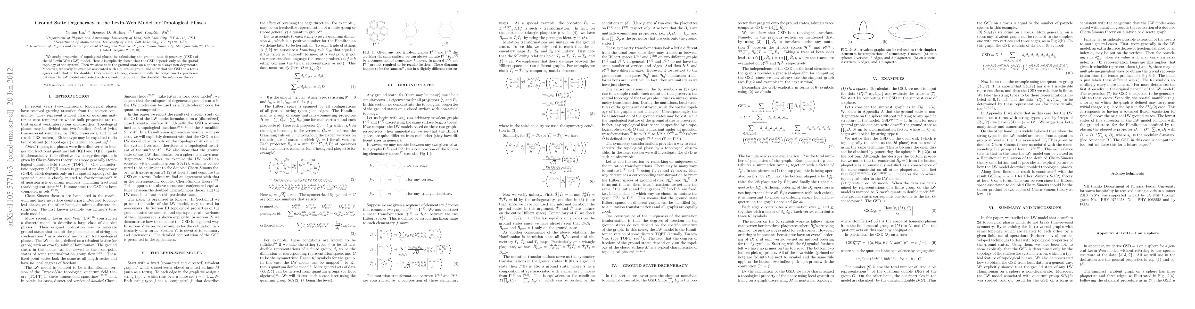 We study properties of topological phases by calculating the ground state degeneracy (GSD) of the 2d Levin-Wen (LW) model. Here it is explicitly shown that the GSD depends only on the spatial topology of the system. Then we show that the ground state on a sphere is always non-degenerate. Moreover, we study an example associated with a quantum group, and show that the GSD on a torus agrees with that of the doubled Chern-Simons theory, consistent with the conjectured equivalence between the LW model associated with a quantum group and the doubled Chern-Simons theory.