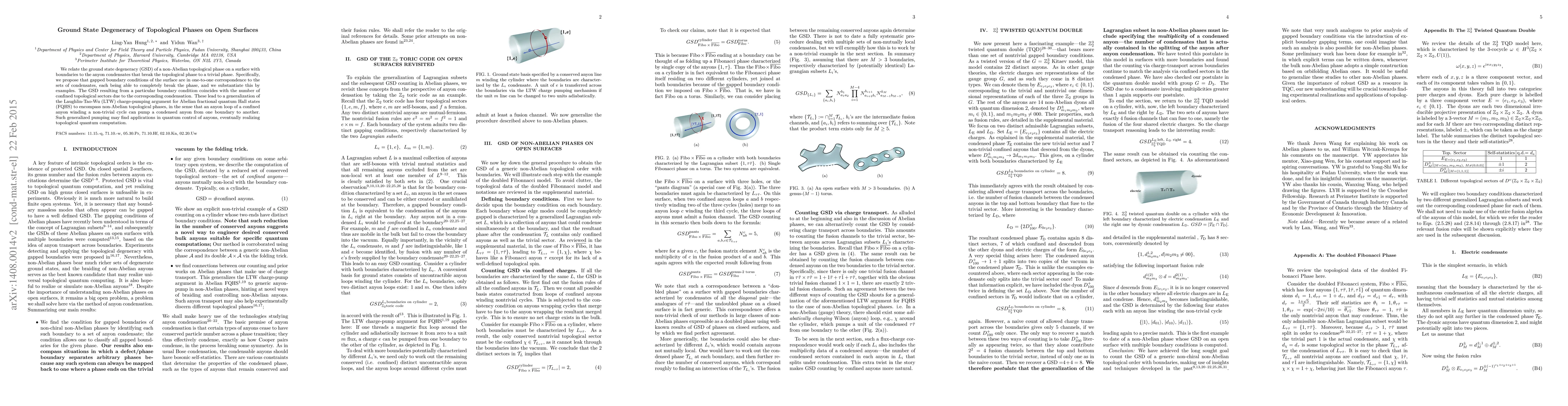 The paper establishes a correspondence between the ground state degeneracy of non-Abelian topological phases on open surfaces and anyon condensates that break these phases, generalizing the Laughlin-Wu-Tao charge-pumping argument, with potential applications in topological quantum computation.