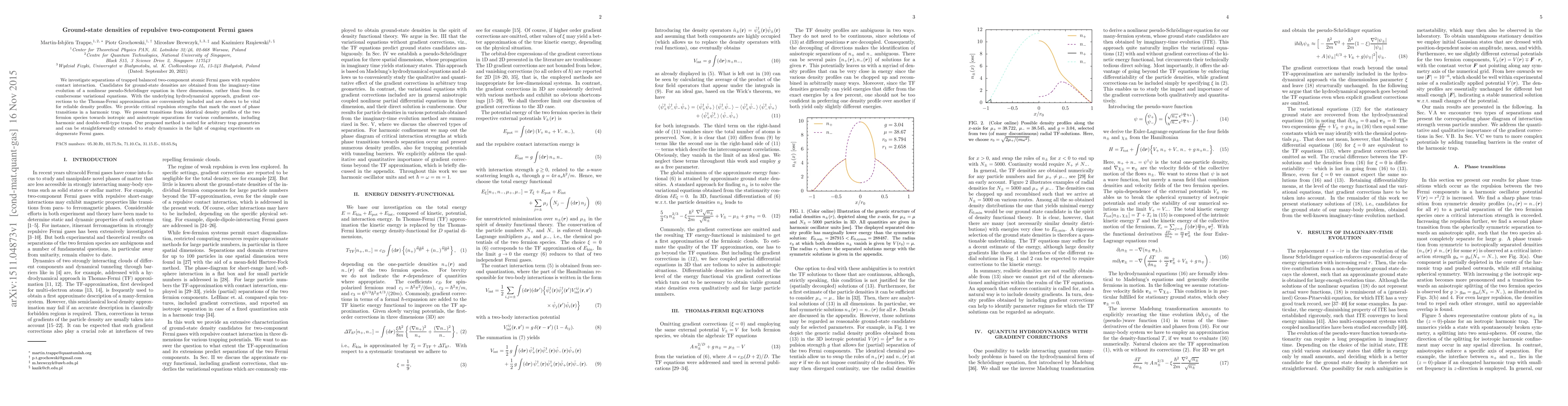 This paper investigates ground-state densities of balanced two-component Fermi gases with repulsive interactions, using a nonlinear pseudo-Schrödinger equation for density profiles. It highlights the importance of gradient corrections for accurate density profiles and identifies critical repulsion strengths for phase transitions in different traps.