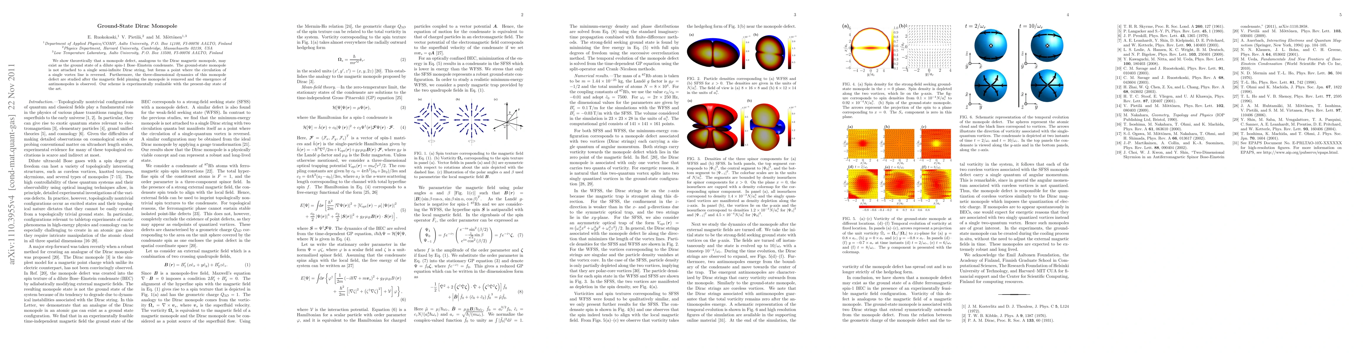 We show theoretically that a monopole defect, analogous to the Dirac magnetic monopole, may exist as the ground state of a dilute spin-1 Bose-Einstein condensate. The ground-state monopole is not attached to a single semi-infinite Dirac string, but forms a point where the circulation of a single vortex line is reversed. Furthermore, the three-dimensional dynamics of this monopole defect are studied after the magnetic field pinning the monopole is removed and the emergence of antimonopoles is observed. Our scheme is experimentally realizable with the present-day state of the art.
