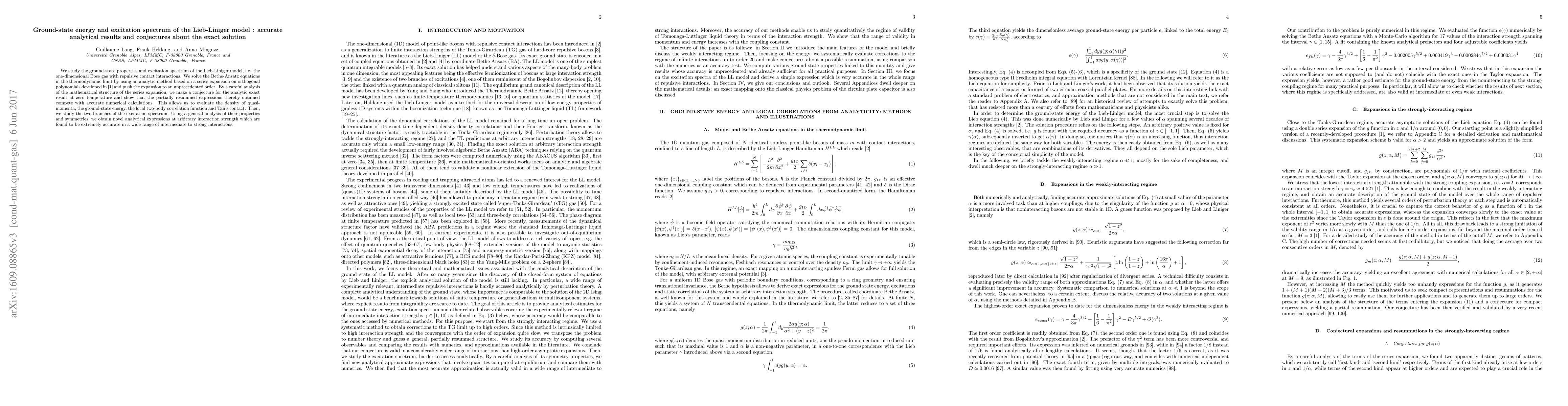 This paper presents analytical solutions for the ground-state energy and excitation spectrum of the Lieb-Liniger model using an advanced series expansion method. The authors conjecture an exact analytical result for zero temperature and demonstrate high accuracy through comparison with numerical calculations.